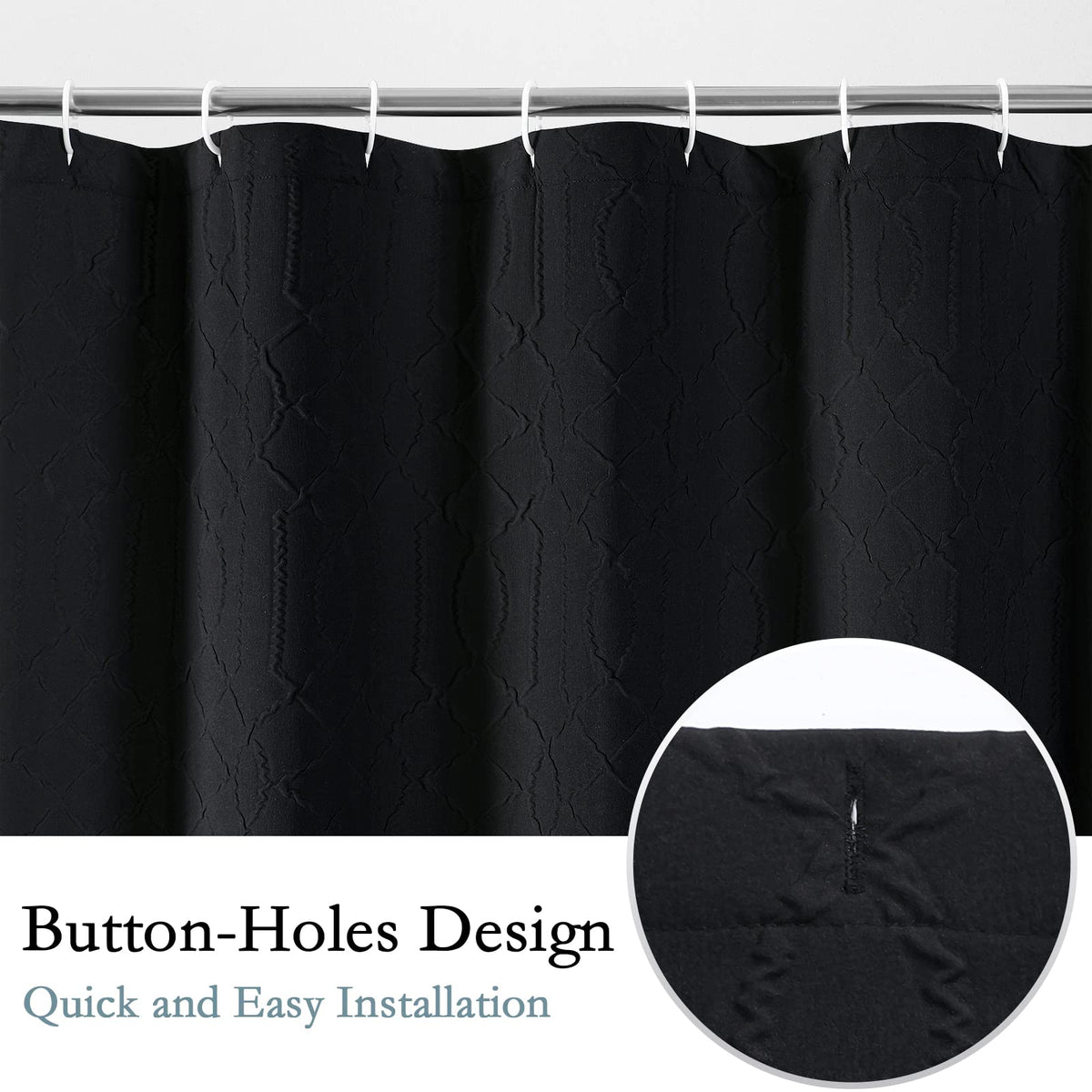 • Q: Does the Gibelle Black Shower Curtain have hooks for easy installation? A: Yes, the shower curtain comes with reinforced buttonholes that work with various types of shower hooks for easy installation.