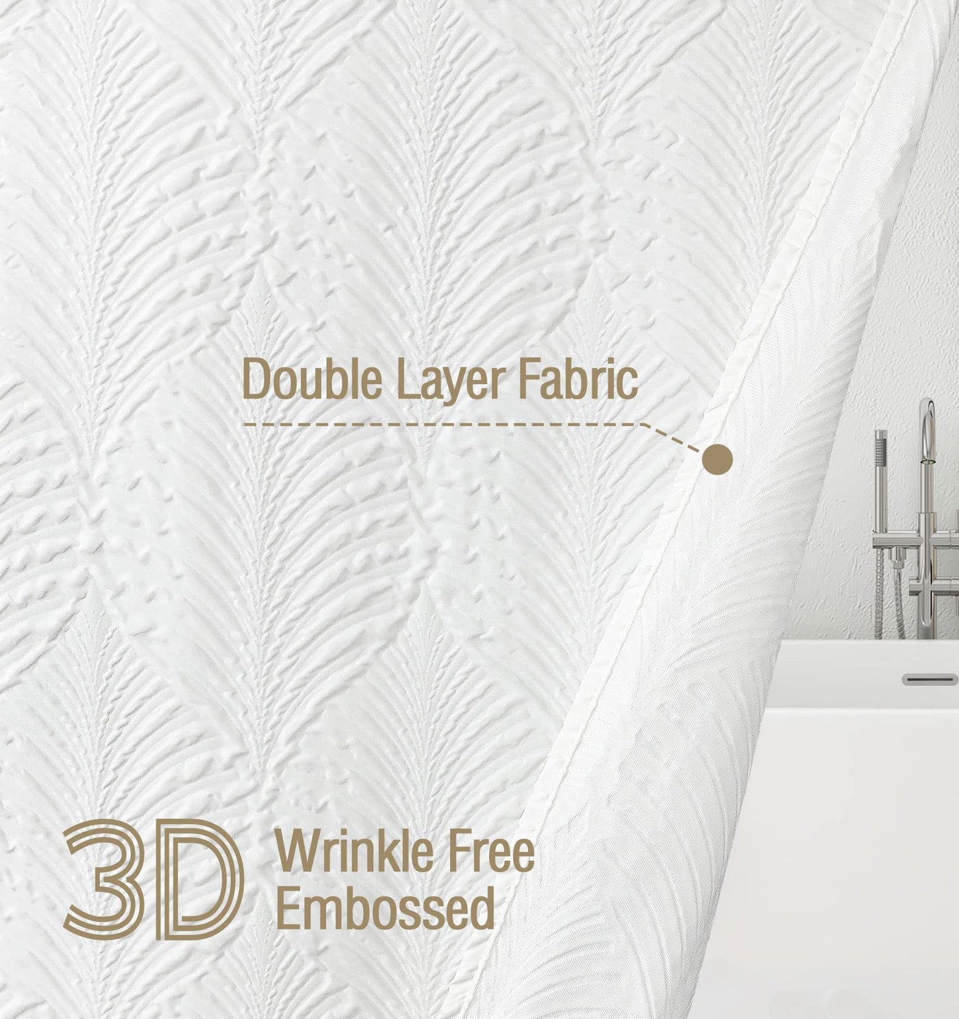 - Q: What is the design style of this shower curtain? A: The shower curtain features a unique 3D embossed texture that creates a ruffle-like effect, giving your bathroom an elegant and spa-like appearance.