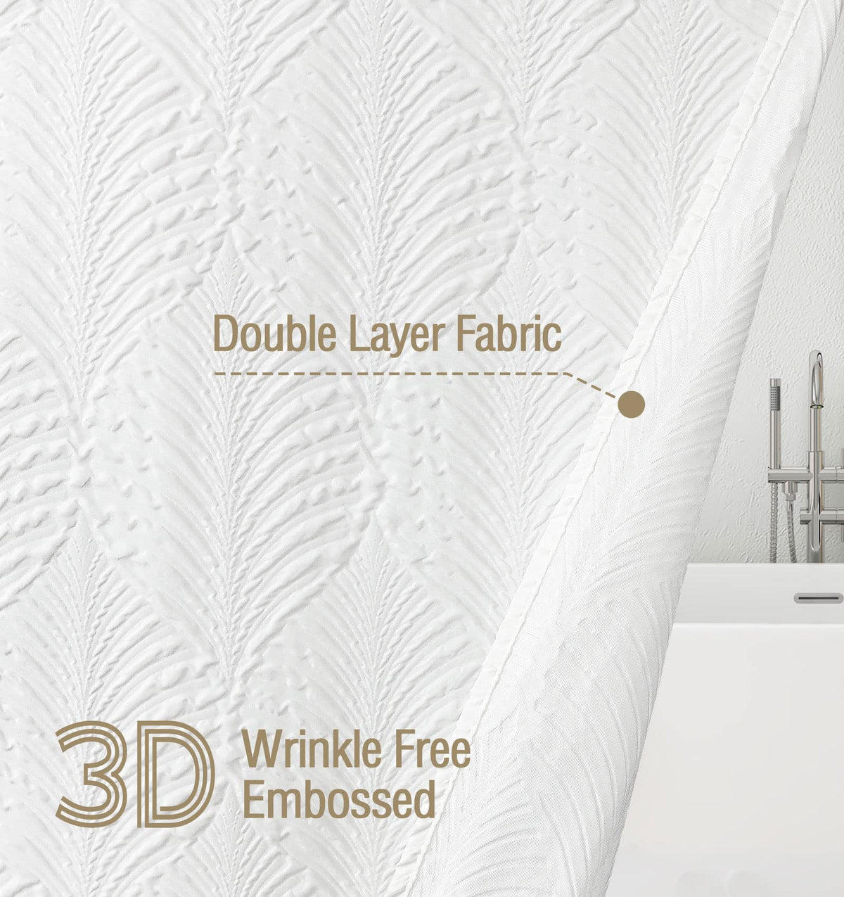 • Q: What is the design style of the Gibelle White Shower Curtain? A: The shower curtain features a unique 3D embossed texture that creates a ruffle-like effect, adding an elegant and modern farmhouse chic look to your bathroom.