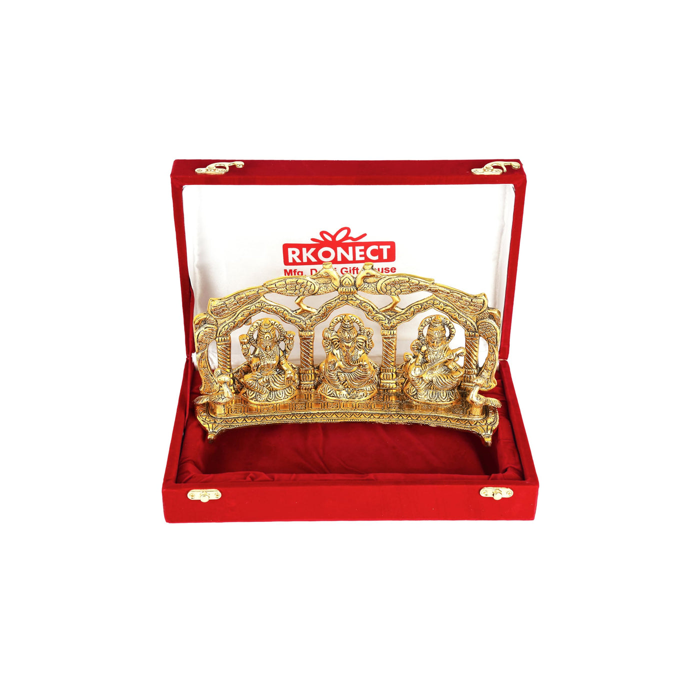 Giftcity Golden Metal Laxmi Ganesh Saraswati Under Peacock Murti Idol Tree Ganesha Idol In Velvet Gift Box || Home Decor For Puj