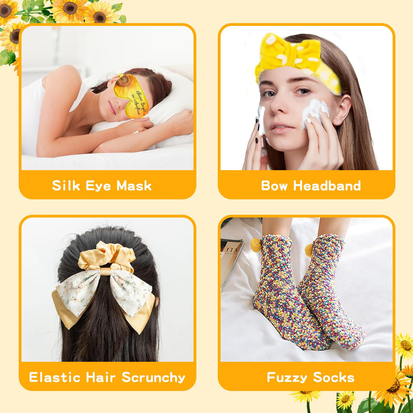 - Q: What items are included in the sunflower gift basket? A: The sunflower gift basket includes a sunflower gift box, an insulated tumbler, a scented candle, a sunflower greeting card, fuzzy socks, a bath bomb, bath sea salt, and a hand-knitted flower sunflower.