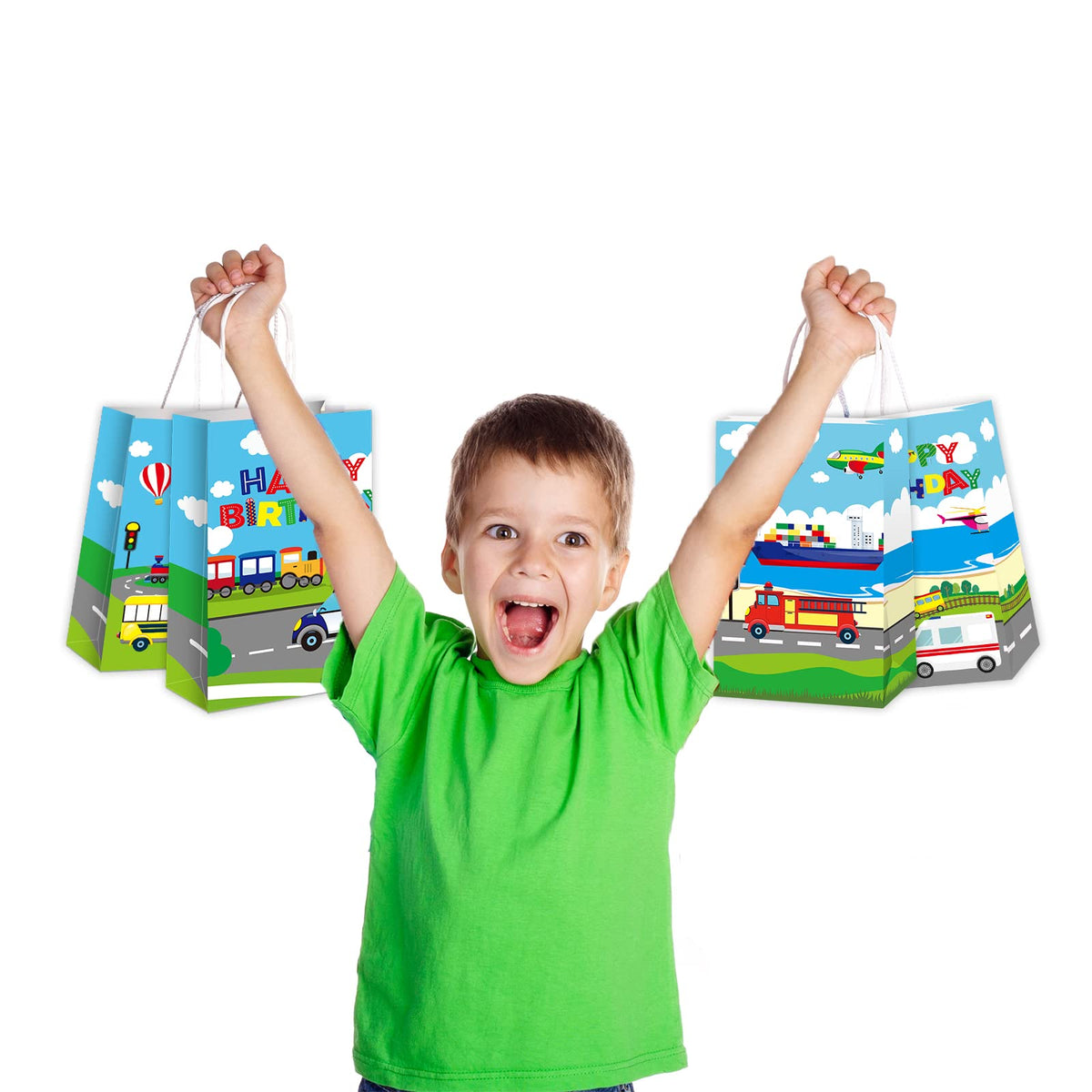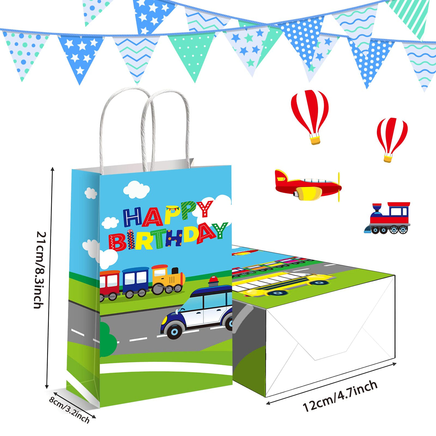 • Q: What is included in the package? A: The package includes 12 pieces of transportation-themed gift bags, each with handles.