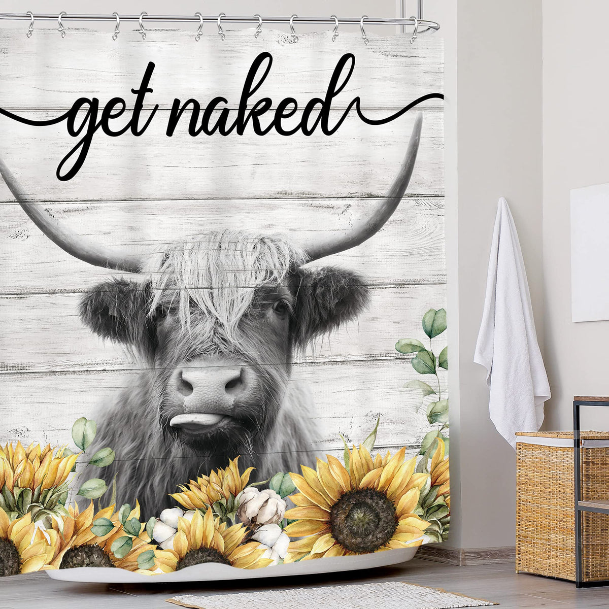 Glawry Rustic Sunflower Highland Cow Shower Curtain Get Naked Farmhouse Bull Bathroom Curtains Set Funny Animal Cattle Wood Barn