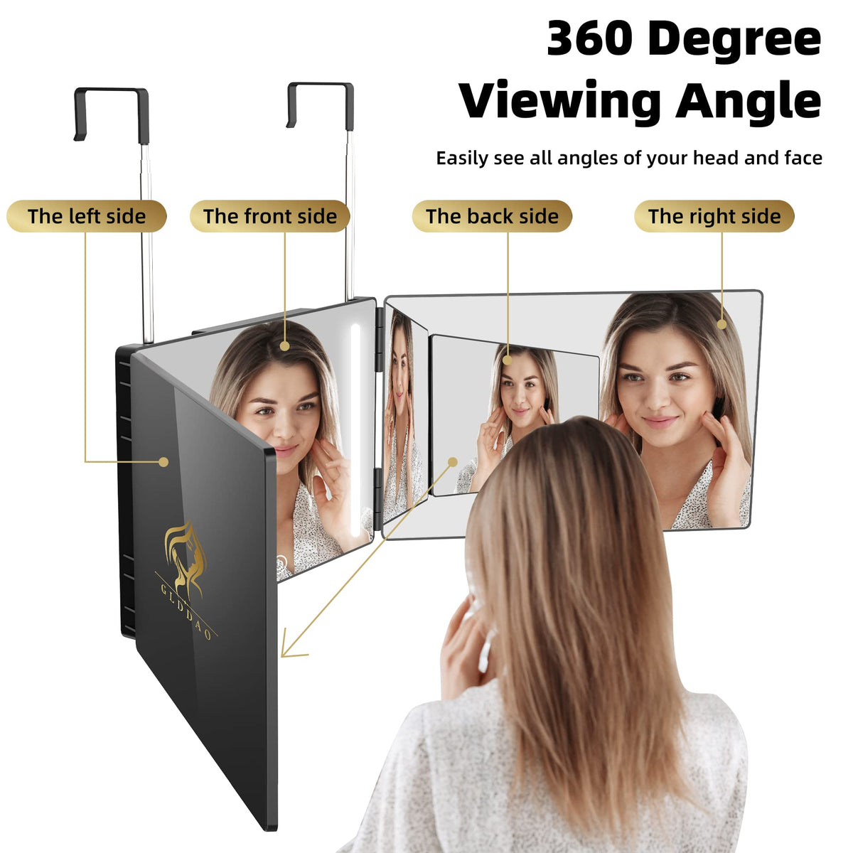 Glddao 3 Way Mirror For Self Hair Cutting With Lights,Rechargeable 360 Trifold Barber Mirrors Led Makeup Mirror See Back Of Head