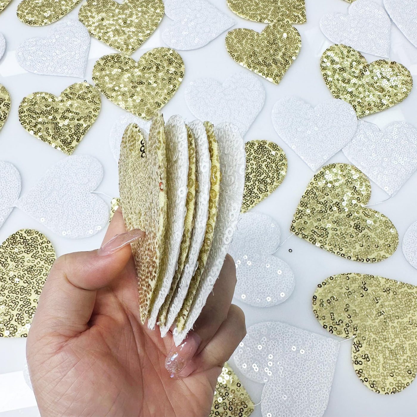 - Q: What materials are used in the Gold and White Heart Decorations? A: The Gold and White Heart Decorations are made from quality sequin fabric combined with soft sponge filling, providing a soft touch and sparkling visuals.