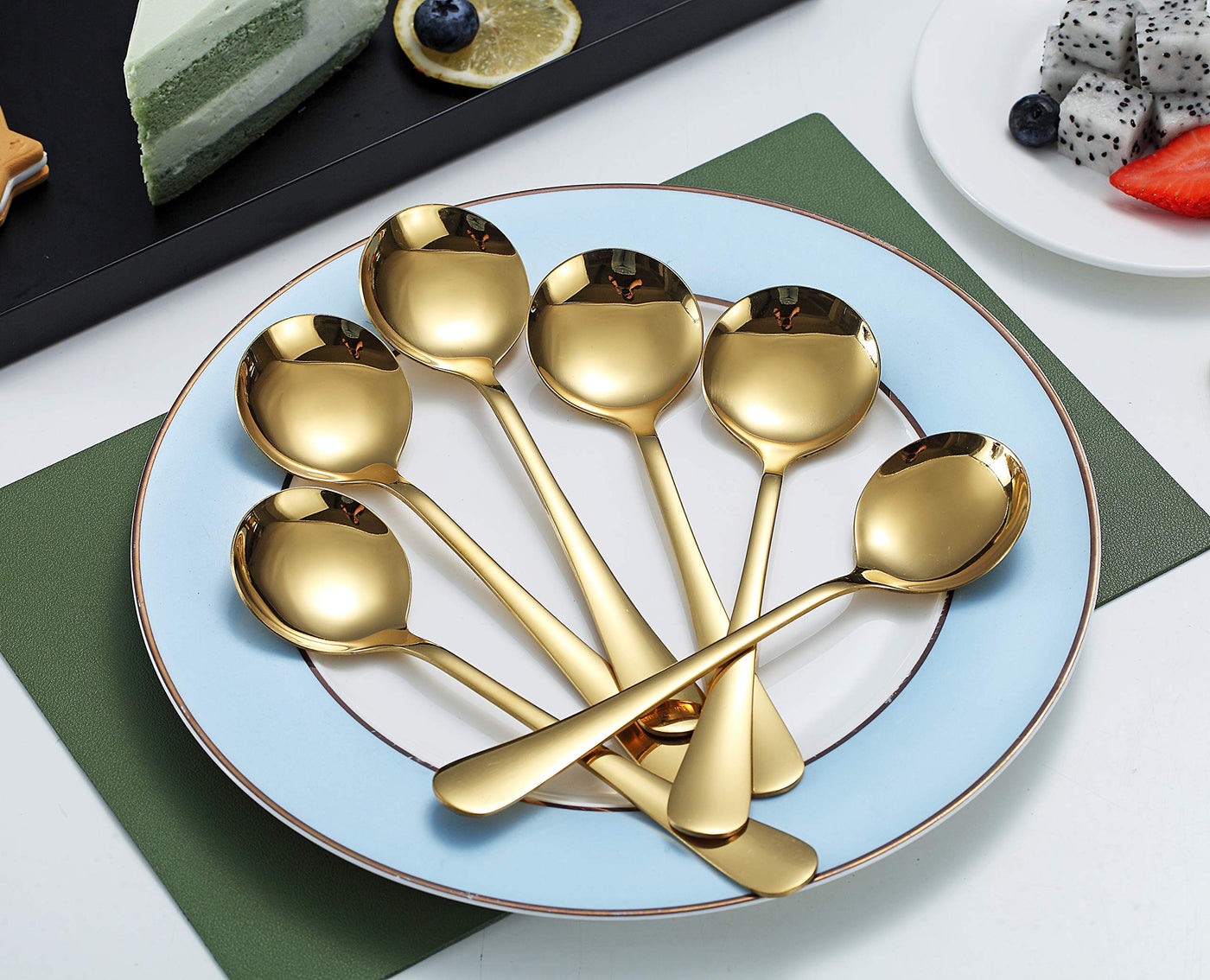 Gold Soup Spoons, Kyraton 6 Pieces Stainless Steel Round Spoons With Gold Titanium Plating, Gold Dinner Spoon Table Spoon, Spoon