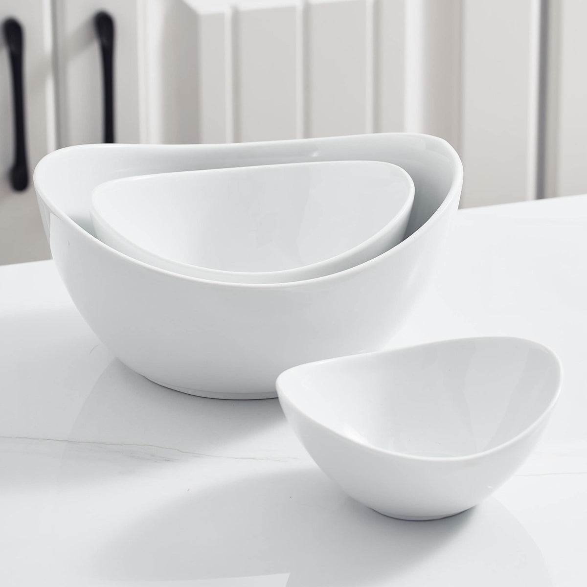 - Q: What is the capacity of the bowls in the serving set? A: The capacity of the three bowls is 45 fluid ounces, 17.5 fluid ounces, and 7 fluid ounces.