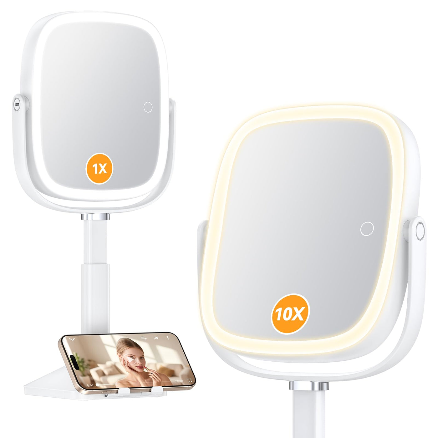 ?Large Rectangle Desk Mirror & Weighted Anti-Slip Base?This 8.5 x 7.4 rectangular mirror offers a more flattering reflection than round mirrors of the same size, better framing your facial features. Its sturdy, detachable weighted base keeps the desk vanity mirror securely in place on your vanity, bathroom counter, or office desk | ?Adjustable Height & Hidden Phone Stand?The extendable stand lets you raise the vanity mirror by 1.57 inches for the perfect angle. When not in use, the built-in phone stand discreetly folds away, keeping your space clutter-free | ?Long-Lasting 4000mAh Rechargeable Battery?With its powerful built-in battery, this LED mirror delivers 3.5 to 22 hours of runtime on a single charge (full charge in approximately 5 hours)-no more frequent recharging | ?3 Lighting Modes & Smooth Dimming?Switch between white, warm, and natural light, then hold the button to adjust the brightness for any makeup or skincare need | ?Dual-Sided Magnification (1X & 10X)?One side provides a standard 1X lighted mirror for hairstyling and full-face makeup, while the 10X magnified mirror side ensures precision for detailed tasks like eyeliner application or eyebrow grooming | ?Convenient Dual-Side Touch Controls?No more flipping the make up mirror to adjust settings-the intuitive touch buttons are accessible on both sides for effortless lighting control | ?Smart Double-Tap Off with Memory Function?A quick double-tap turns the lights off instantly, skipping the hassle of cycling through modes. Plus, the white mirror remembers your last brightness and color setting for next time | ?Great Gift Choice?Surprise your sister, wife, girlfriend, or mother with this fantastic beauty gift on special occasions like anniversaries, birthdays, Mother s Day, Valentine s Day, and Christmas. They will be delighted with this thoughtful and practical present | ?Satisfied Service? If you have any questions, please feel free to contact us at any time. We will reply and provide you with solutions within 12 hours. Thanks for your support | ?Zufriedenstellender Service? Wenn Sie Fragen haben, k