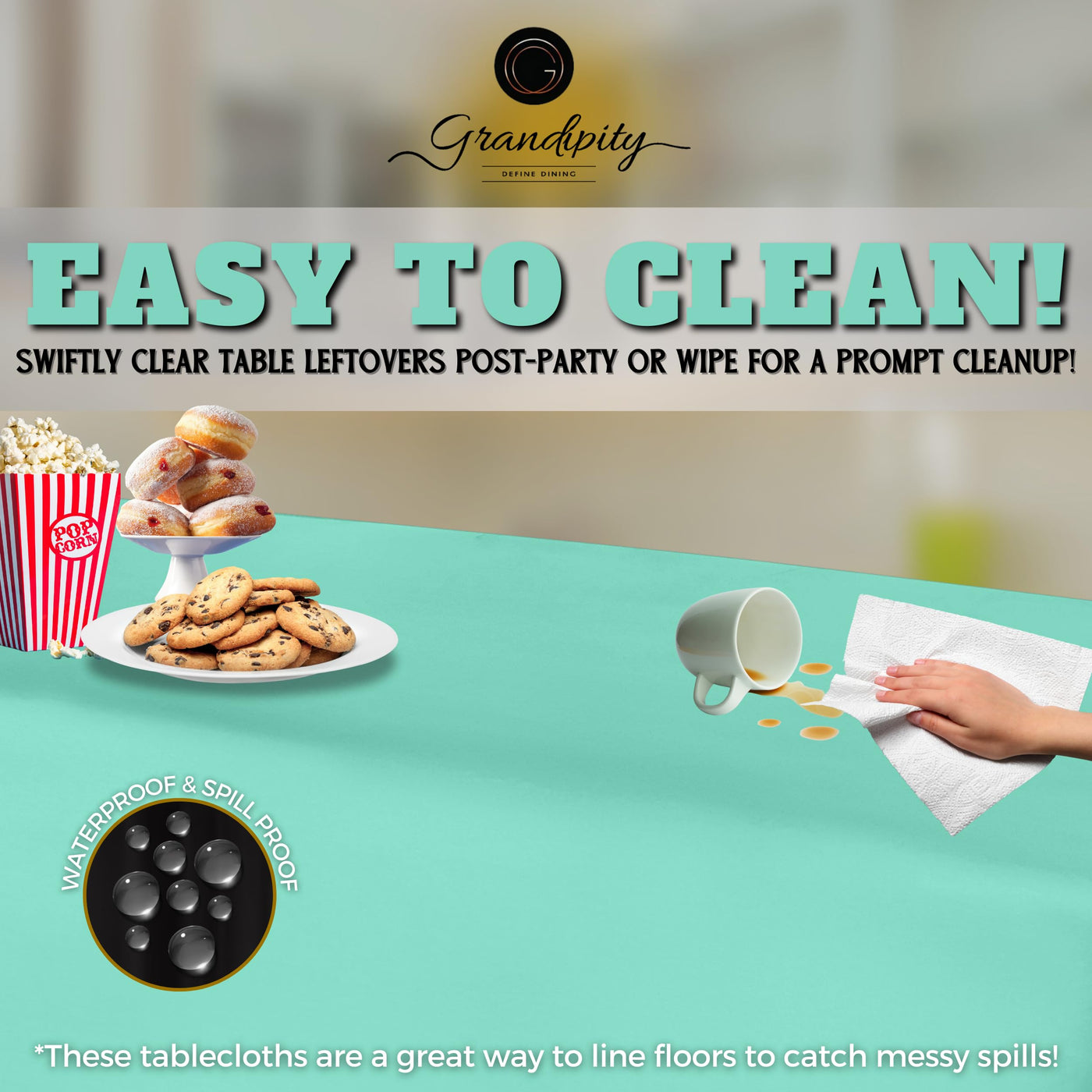 • Q: Is this tablecloth disposable? A: Yes, the Grandipity tablecloth is made of plastic and is designed for single-use, making cleanup easy after events.