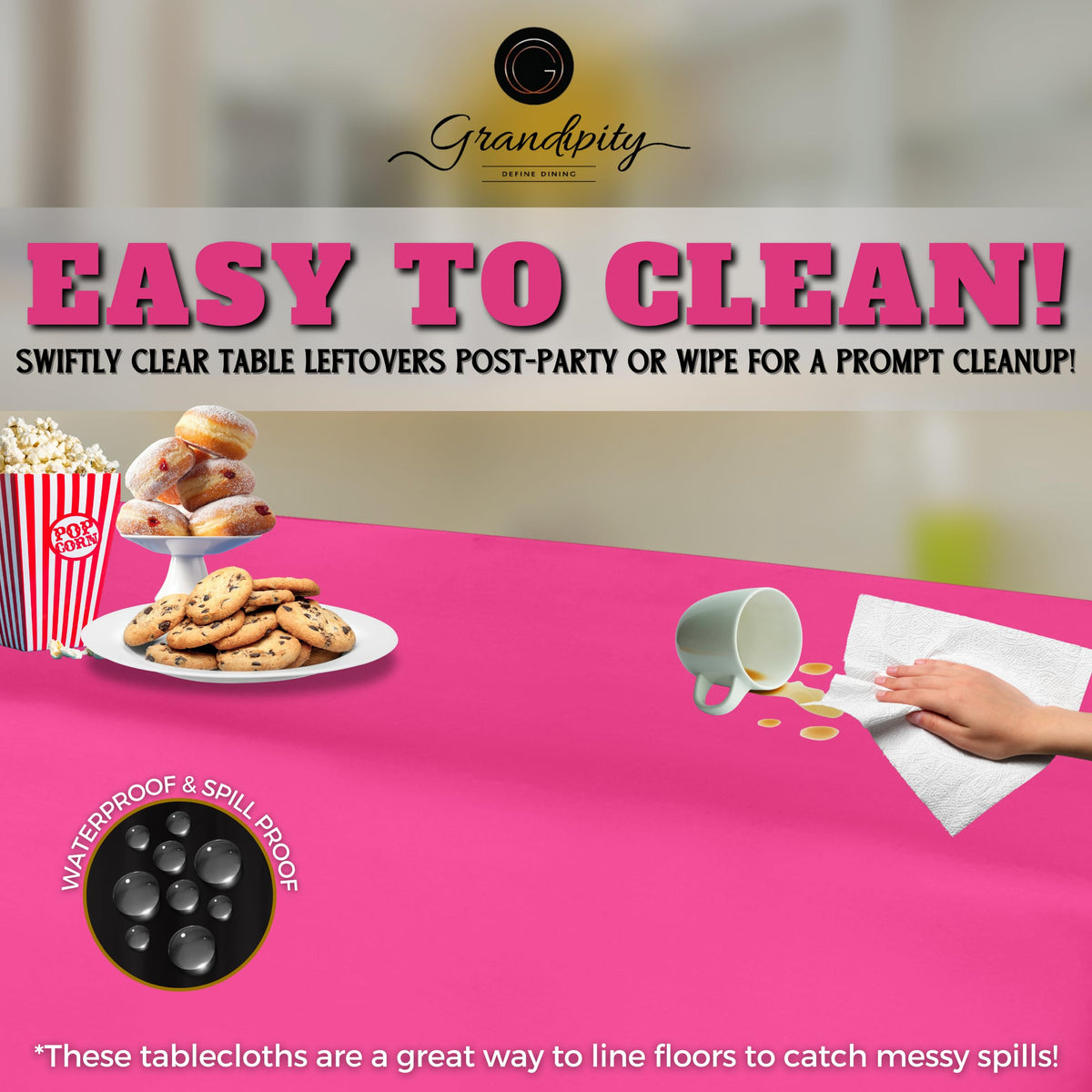 - Q: How easy is it to clean up after using the tablecloth? A: Cleanup is very easy, as the tablecloth is disposable and designed to catch spills, allowing you to enjoy your event without worrying about mess.