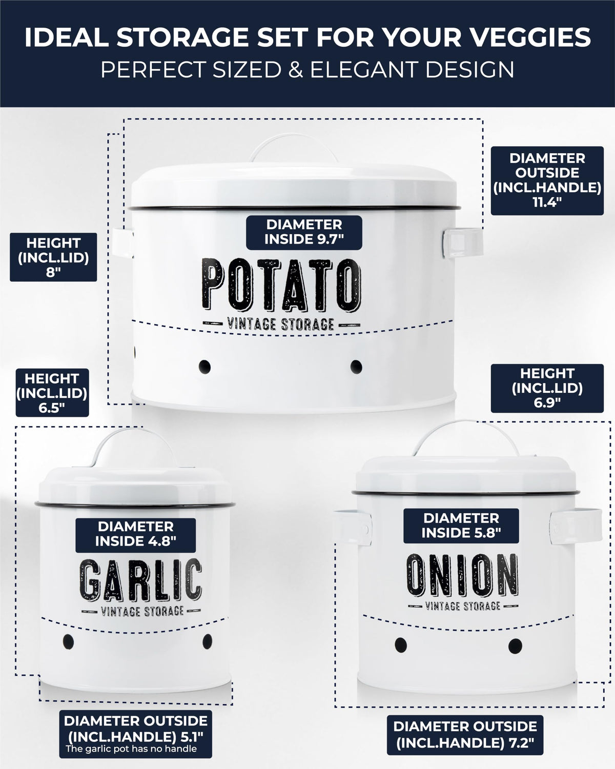 • Q: What are the heights of the containers, including the lid? A: The potato box is 8 inches tall, the onion container is 6.9 inches tall, and the garlic keeper is 6.5 inches tall.