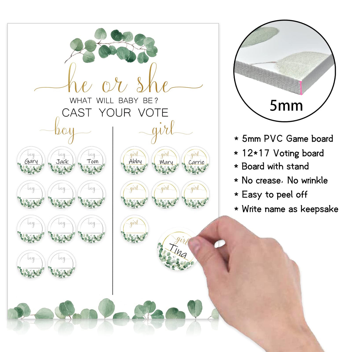 - Q: Does the board come with voting stickers? A: Yes, the set includes 60 pre-cut voting stickers, with 30 for girls and 30 for boys, allowing guests to easily cast their votes.