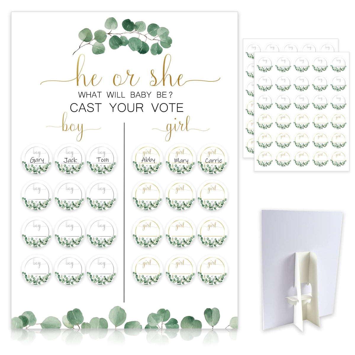 Greenery Baby Gender Reveal Board With Stand(12X17), 60 Eucalyptus Leaf Boy Girl Voting Stickers,He Or She, Cast Your Vote Game,