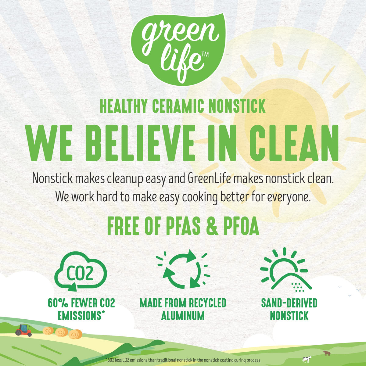 - Q: What materials are used in the GreenLife cookware? A: The cookware vessels (excluding handles) are made from a minimum of 65% recycled aluminum, contributing to its eco-friendly design.