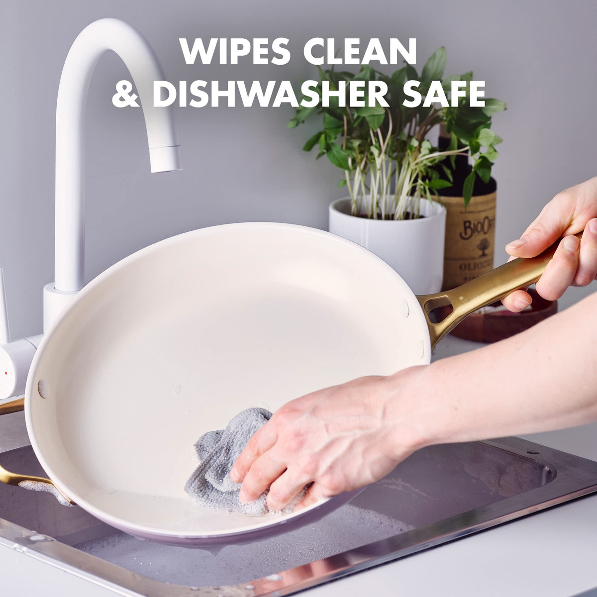 • Q: How do I clean the GreenPan frying pan? A: The frying pan is dishwasher safe for easy cleanup, but most messes can be wiped clean with a soft cloth.