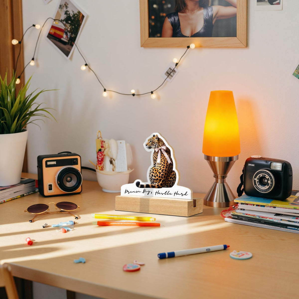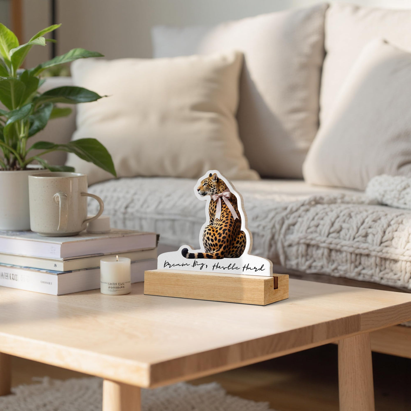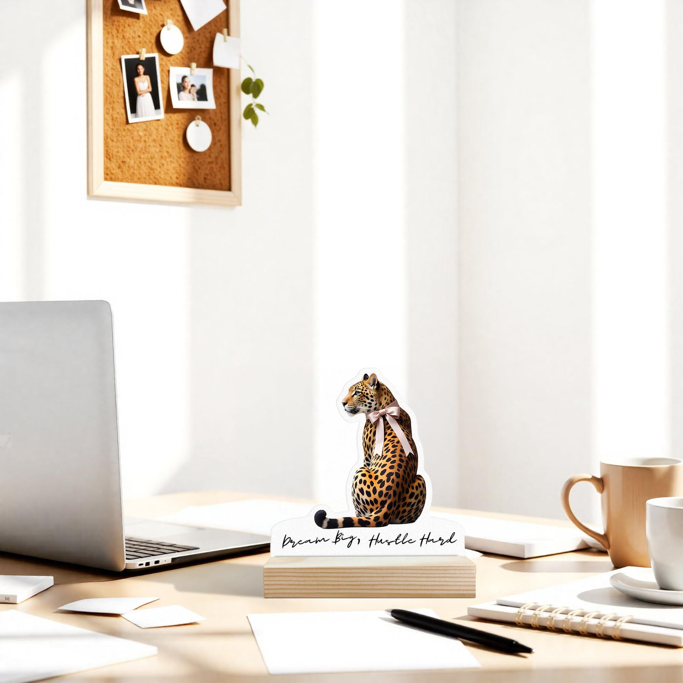 GTYNU Trendy Cheetah Desk Decor Sign, Funky Leopard with Coquette Bow Shaped Wood Sign Plaque with Wooden Stand for Home Office