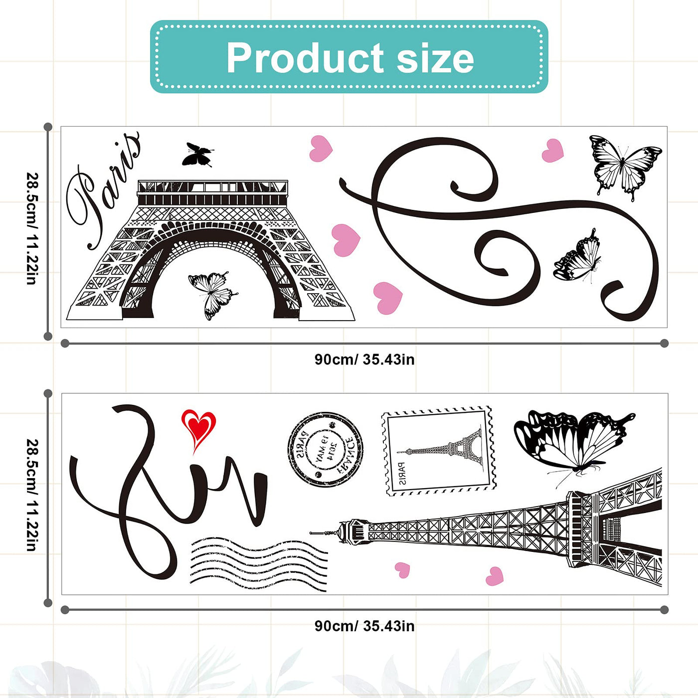 - Q: How many stickers are included in the package? A: The package includes two sheets of Paris tower wall stickers, featuring one piece of Eiffel tower sticker, letters of Paris, butterflies, and hearts.