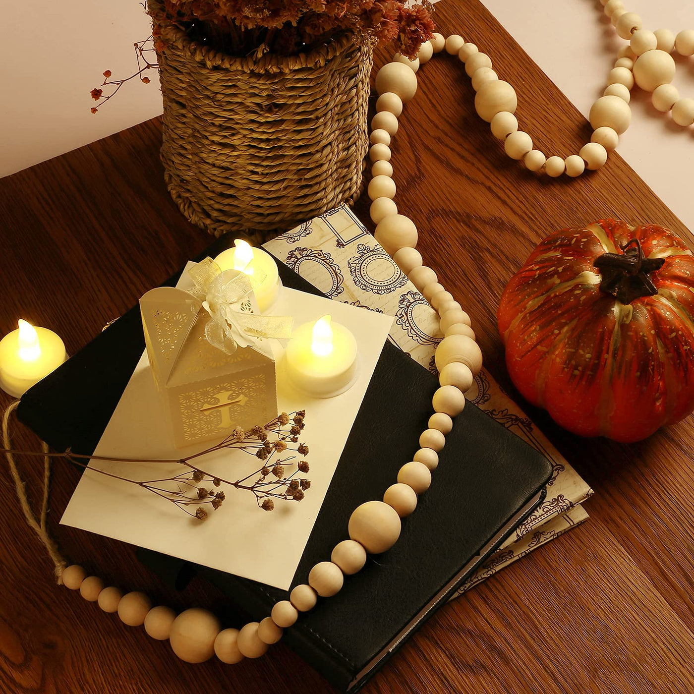 GWHOLE 7.2 Ft Christmas Wooden Bead Garland Boho Natural Prayer Beads for Christmas Tree Mantel Table Modern Farmhouse Home Rust