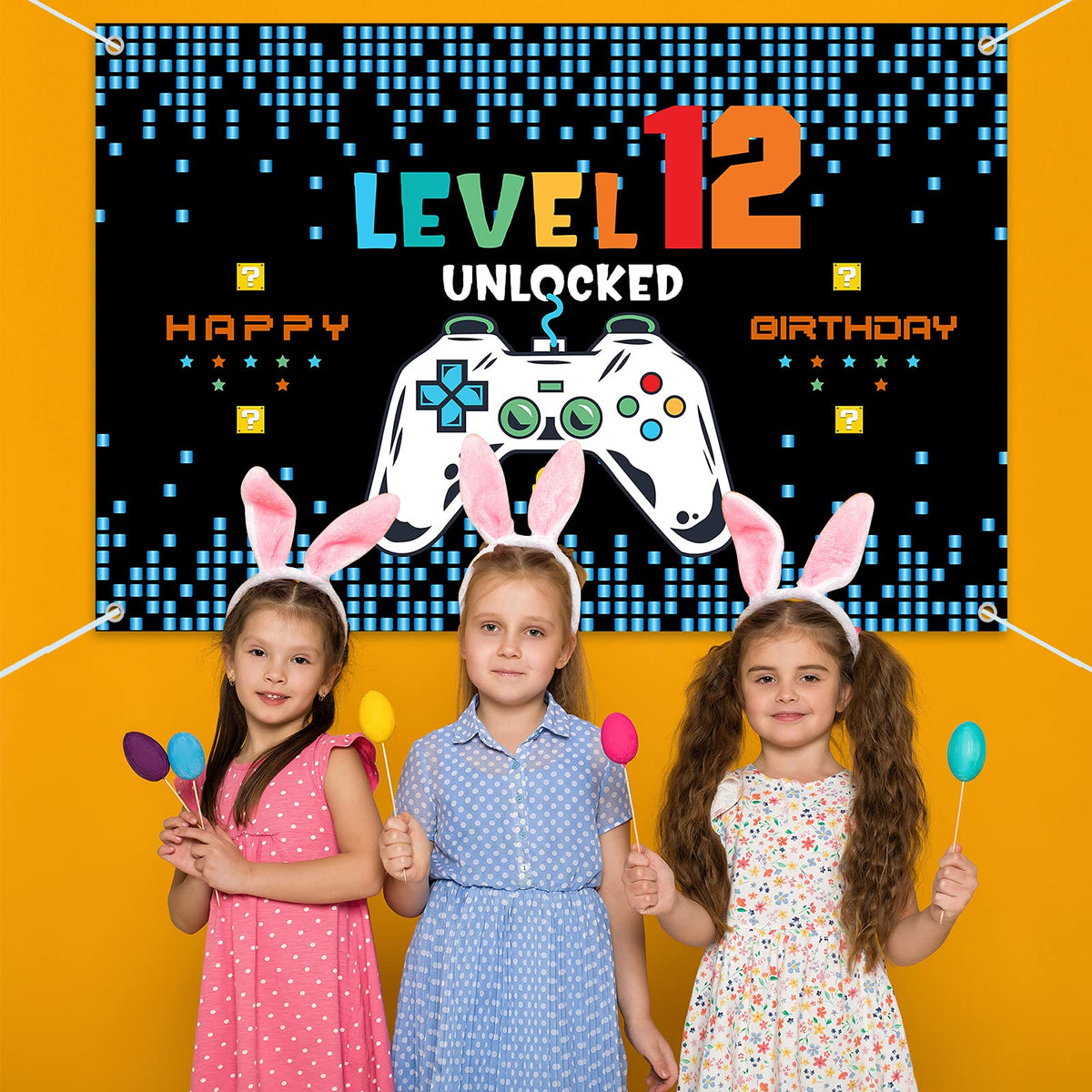 Hamigar 6X4Ft Happy 12Th Birthday Baner Backdrop - Level 12 Unlocked Birthday Decorations Party Supplies For Boys - Blue