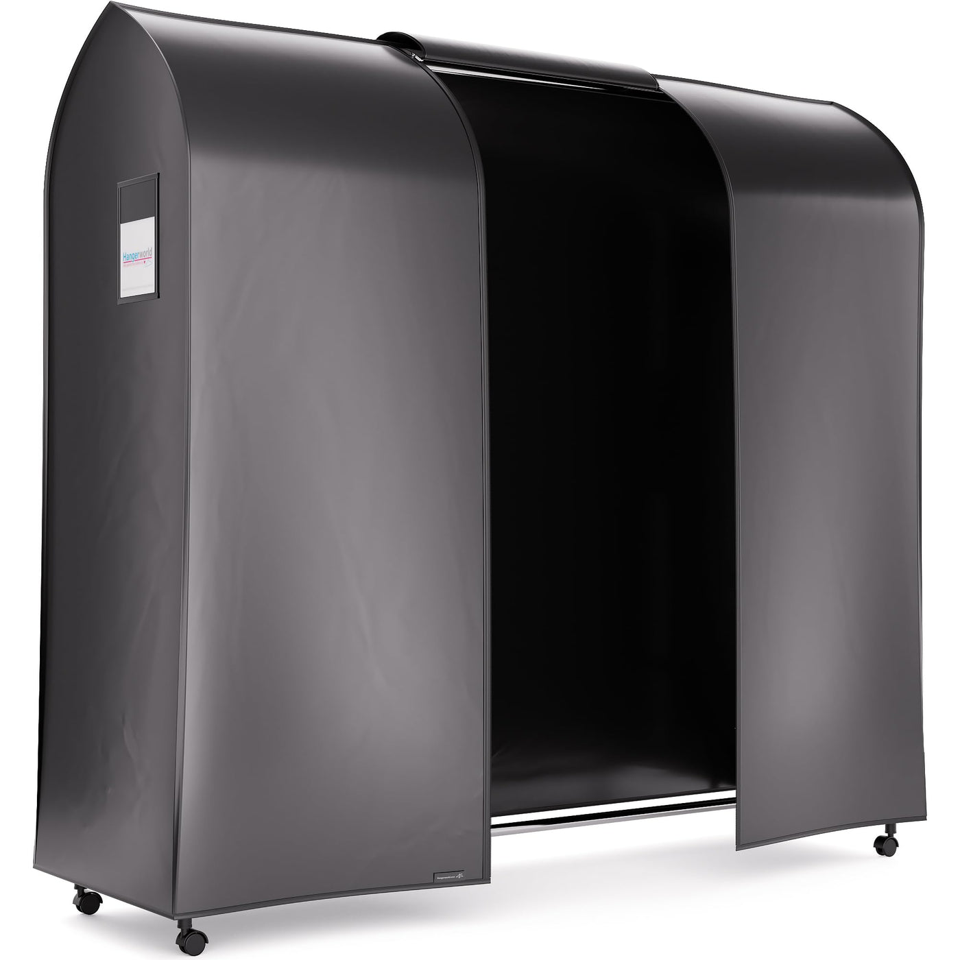 - Q: Can this cover protect clothes from dust and light exposure? A: Yes, the cover fully protects hanging clothes from dust, fluff, and smells, while its opaque black material helps prevent fading from light exposure.