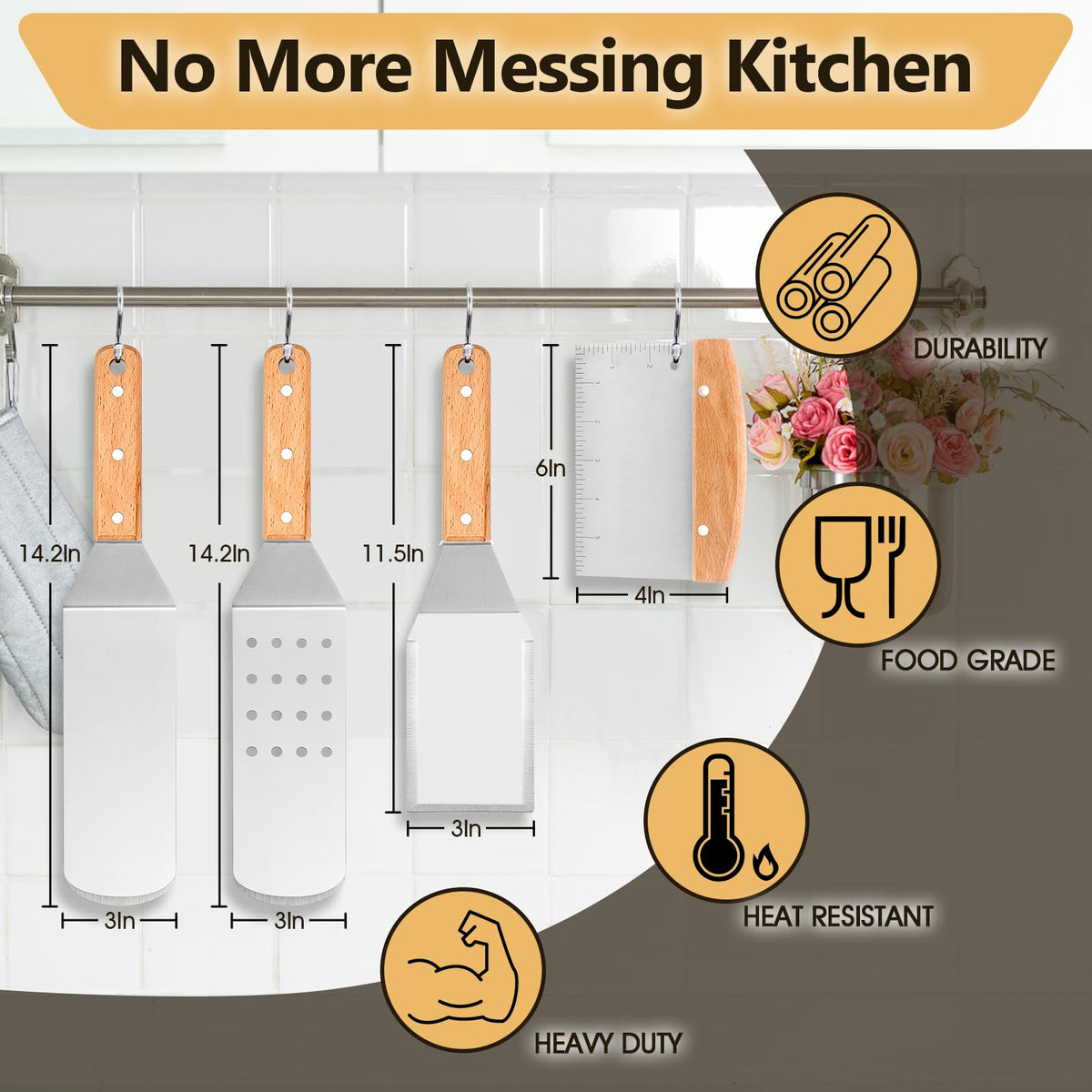 - Q: What is included in the spatula set? A: The set includes one 14.2 inches solid pancake flipper, one 14.2 inches perforated metal spatula, one 11.5 inches small burger turner, one griddle bench scraper, and four S-hooks for convenient storage.