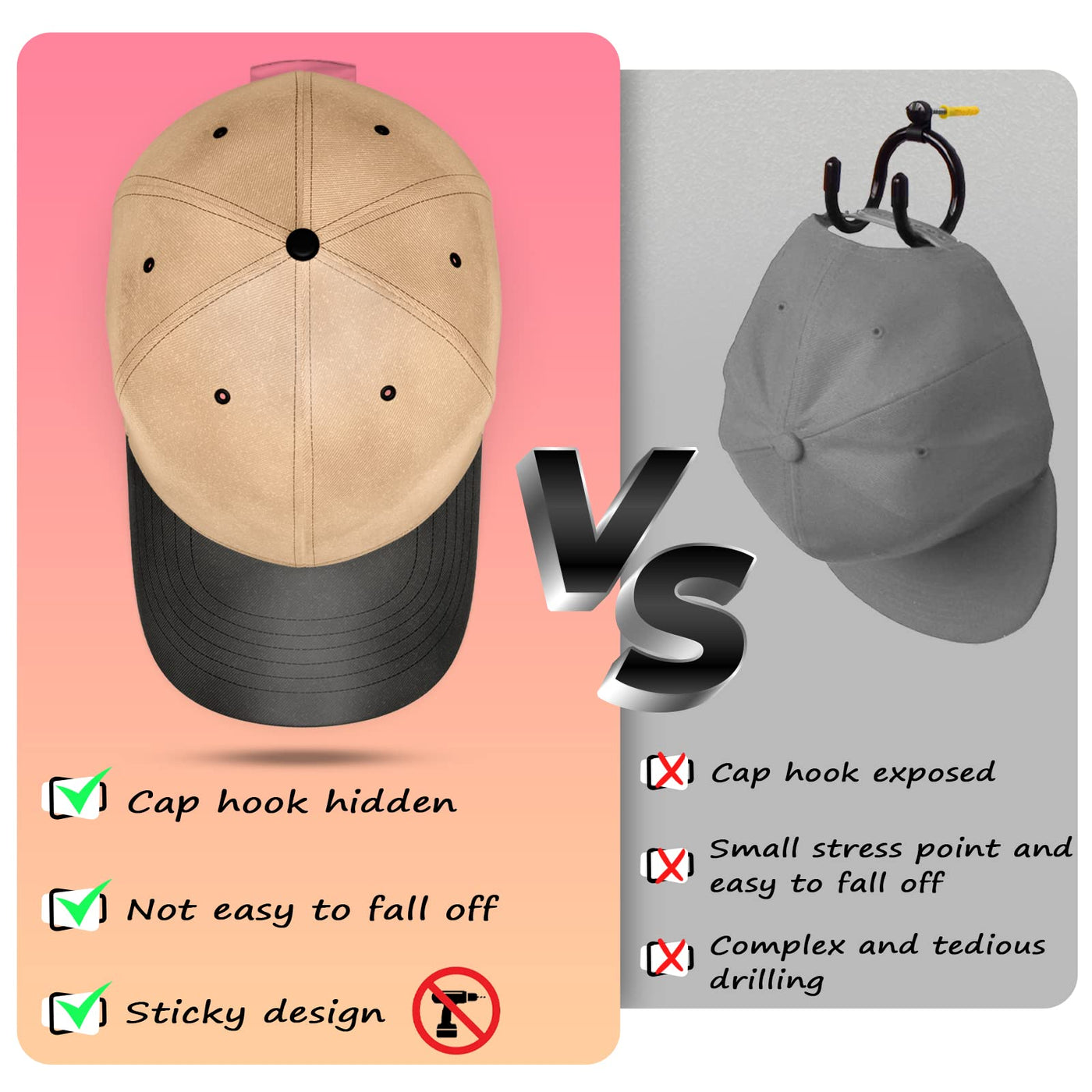 - Q: Do I need to drill holes to install the hat racks? A: No, the hat racks are self-adhesive and do not require drilling for installation.