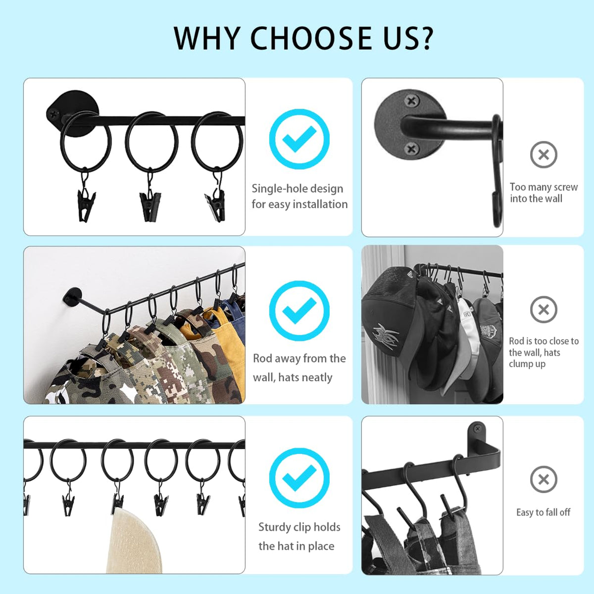 • Q: Is the hat rack sturdy enough for heavy hats? A: Yes, the heavy-duty construction and strong stainless steel clips are designed to securely hold even heavier hats without damaging them.