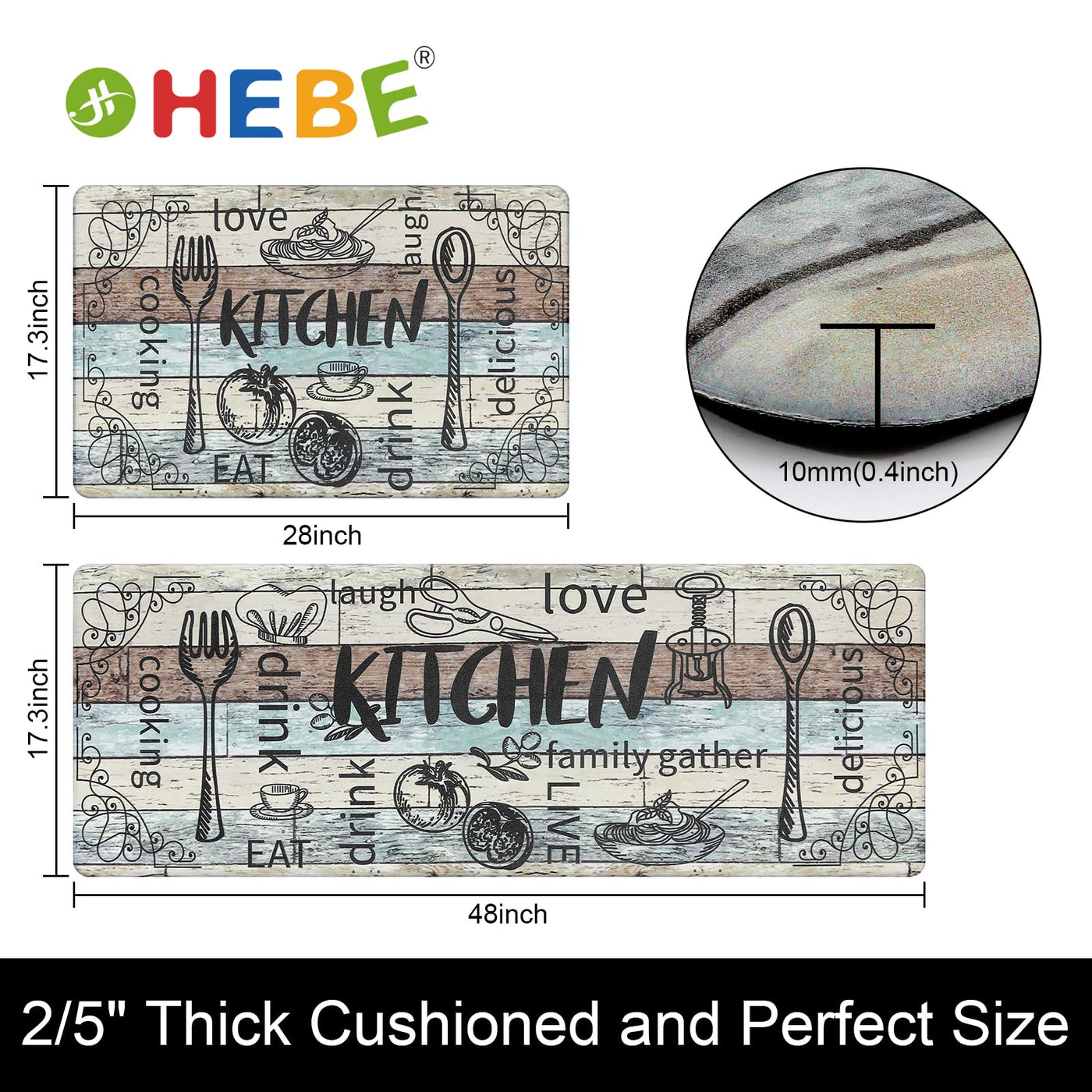 • Q: What are the dimensions of the HEBE Anti Fatigue Kitchen Mats? A: The HEBE Anti Fatigue Kitchen Mats come in two sizes: 17.3 inches by 28 inches and 17.3 inches by 48 inches.