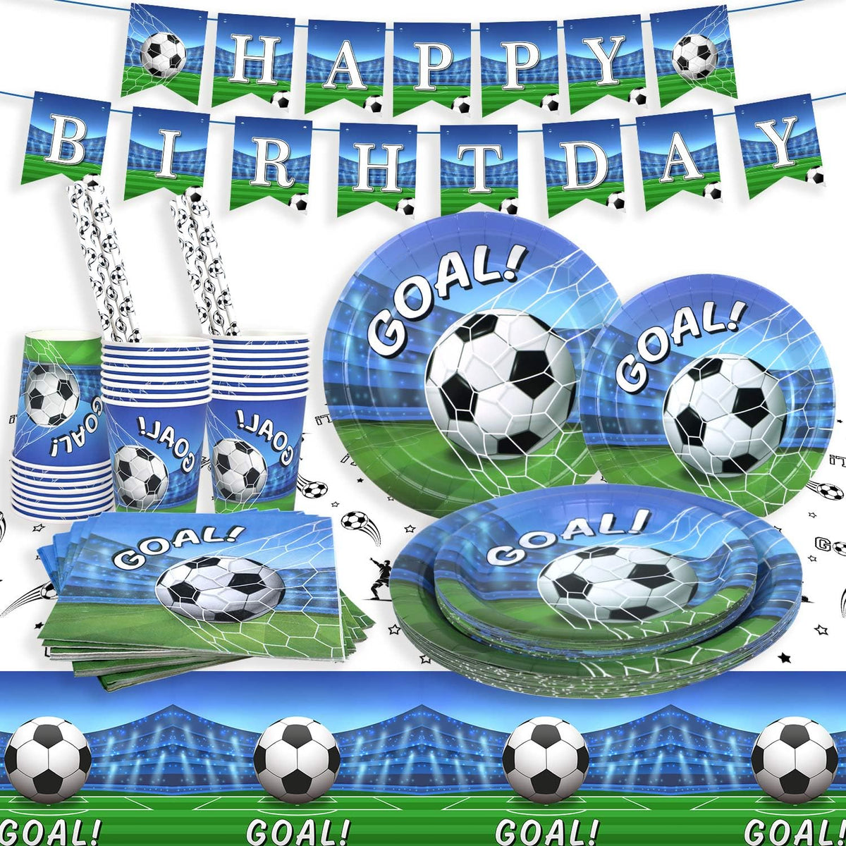 - Q: What is included in the Soccer Birthday Party Decorations Plates Set? A: The set includes dinner plates, dessert plates, cups, napkins, and cutlery for 25 guests, totaling 125 pieces.