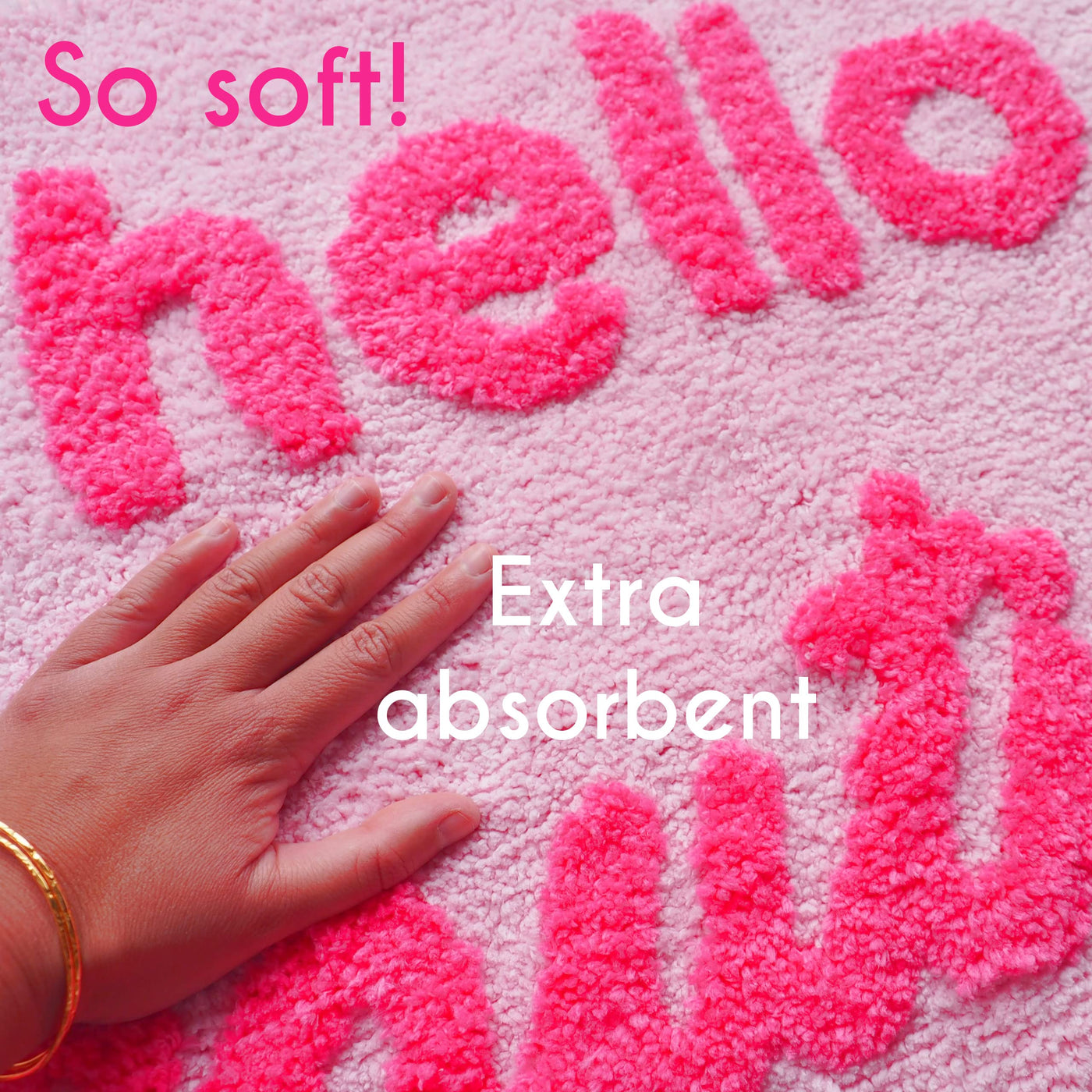 • Q: What material is the Evovee Hello Beautiful Bath Mat made from? A: The specific material is not mentioned, but the mat is designed to be super absorbent and fluffy, providing a luxurious feel.