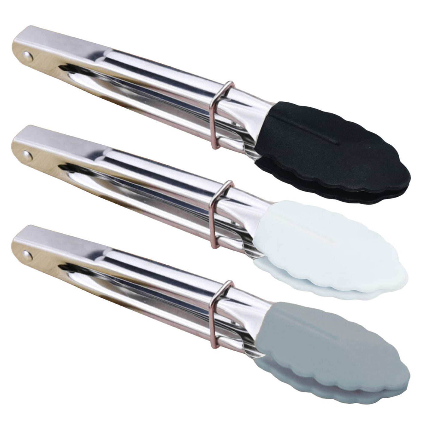 Hinmay Mini Tongs With Silicone Tips 7-Inch Small Serving Tongs, Set Of 3 (Black White Gray)