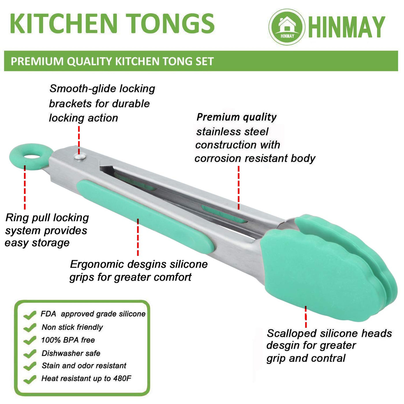 • Q: Are these tongs dishwasher safe? A: Yes, the HINMAY tongs are dishwasher safe for easy cleaning.