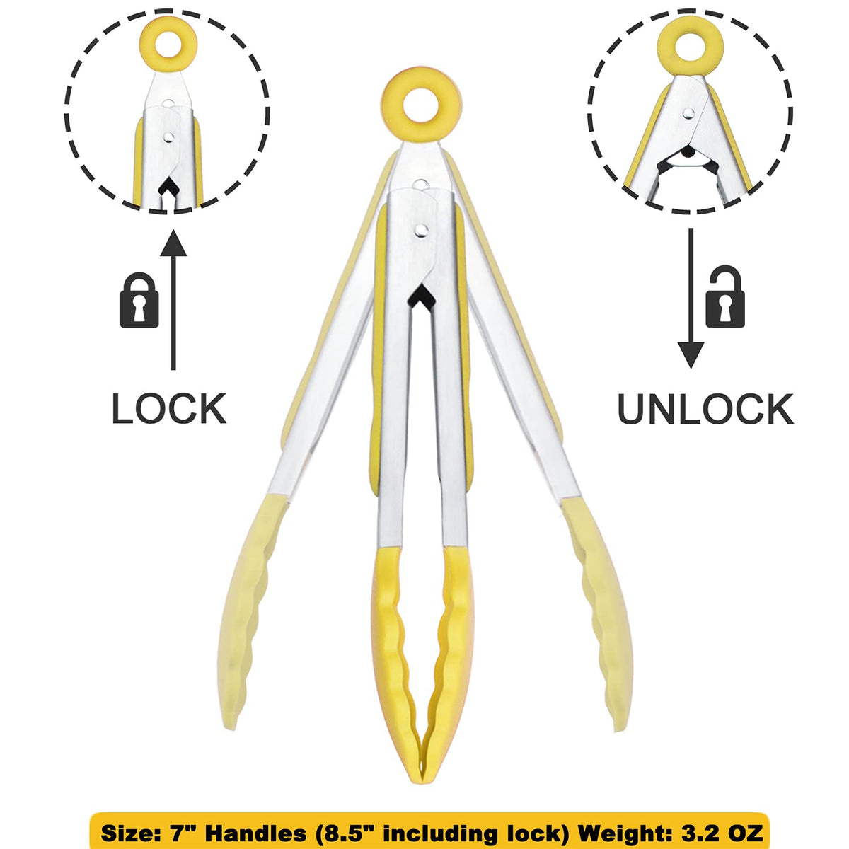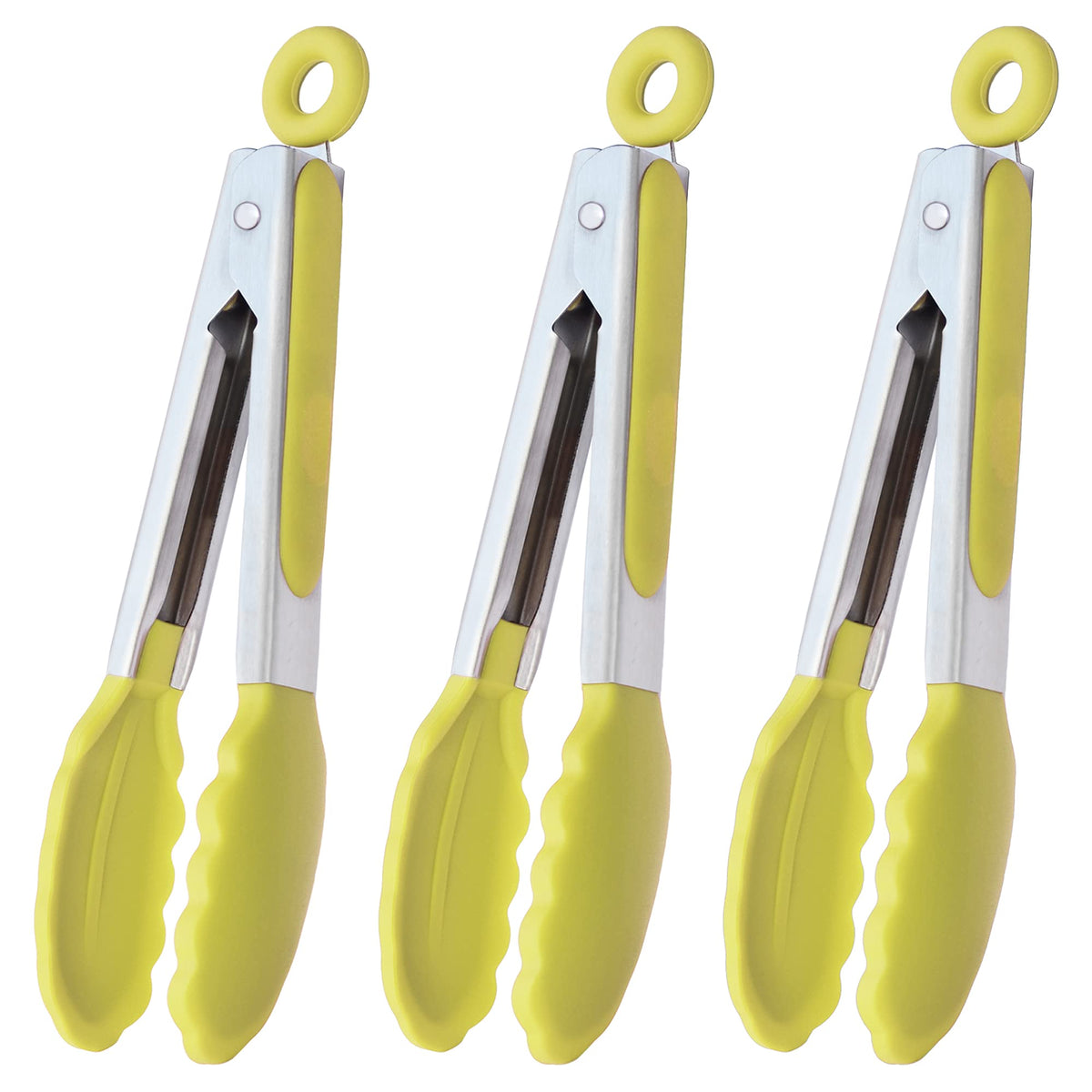 Hinmay Small Appetizer Tongs 7-Inch Silicone Tipped Kitchen Tongs, Set Of 3 (Yellow)