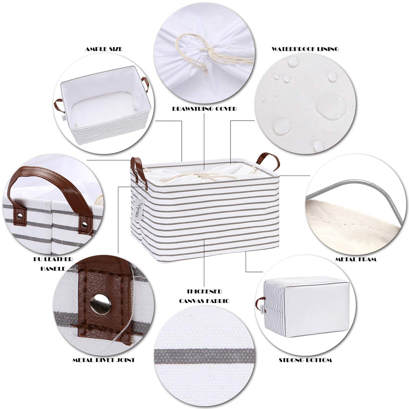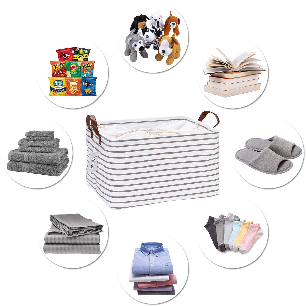 • Q: What materials are used in the construction of this storage basket? A: The storage basket is made of thickened canvas fabric with a waterproof PE lining and features PU leather handles for easy transport.