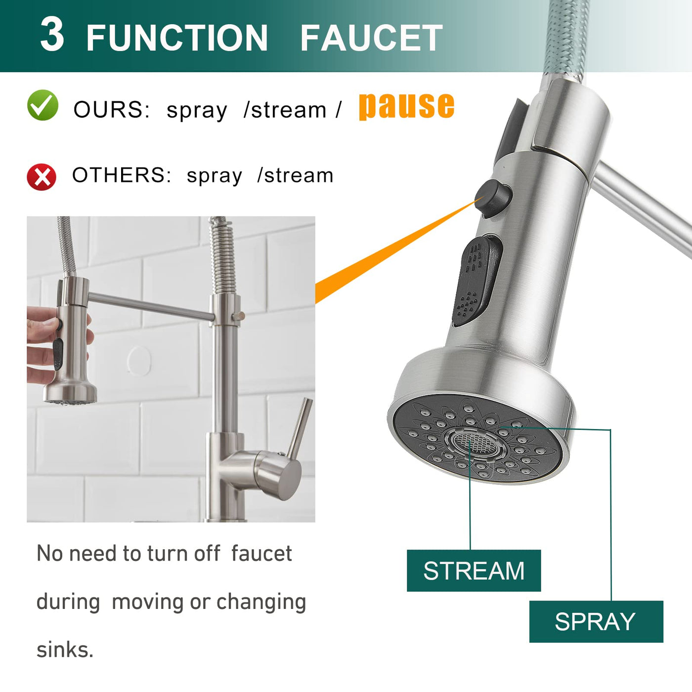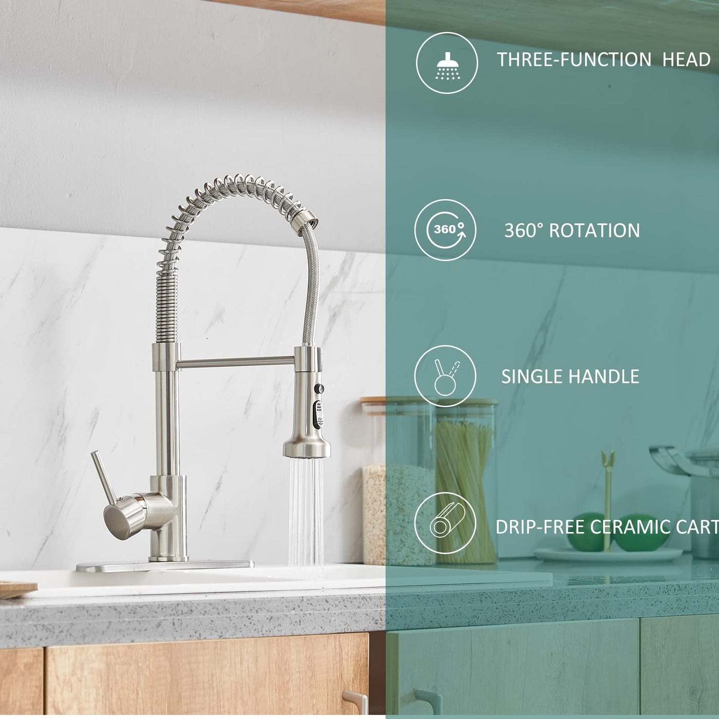- Q: What are the key features of the Hoimpro Brass Spring Kitchen Faucet? A: The Hoimpro Brass Spring Kitchen Faucet features a three-function sprayer head (stream, spray, pause), a high-arch design for 360-degree rotation, lead-free brass construction, and a brushed nickel finish that resists tarnishing and peeling.