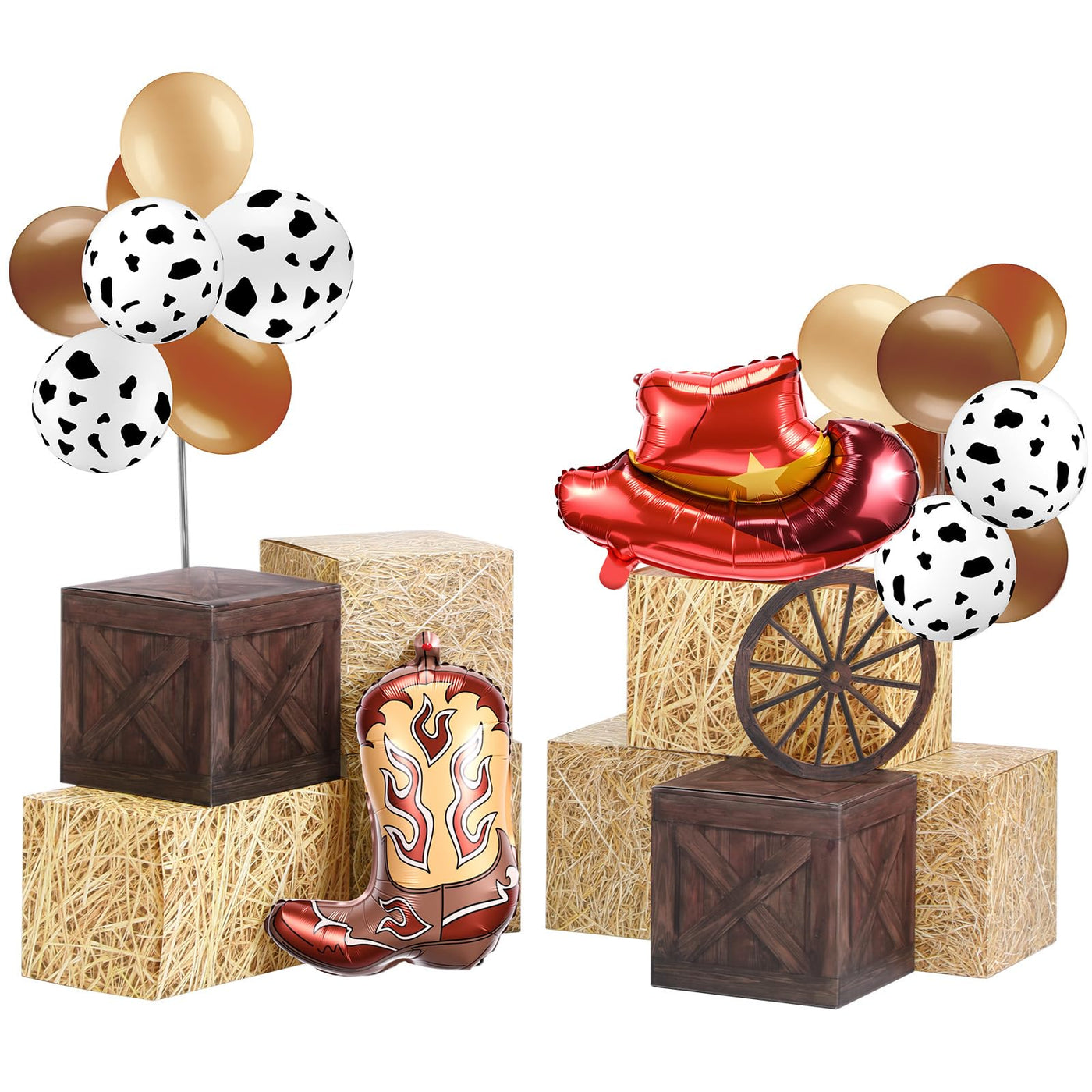 Hollowfly 27 Pcs Western Cowboy Party Decorations, Hay Bales Boxes Wood Grain Boxes Inflatable Cowboy Boot Hat Balloons Wheel Ce
