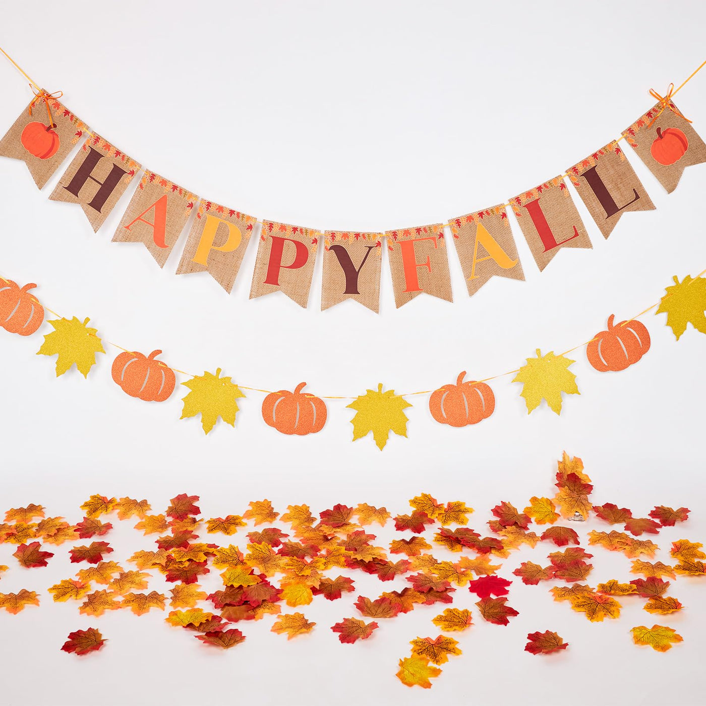Homarkable Pre-Strung Happy Fall Burlap Banner, Pumpkin Banner, and 100 Pcs Maple Leaf Confetti for Autumn Fall Thanksgiving Hom