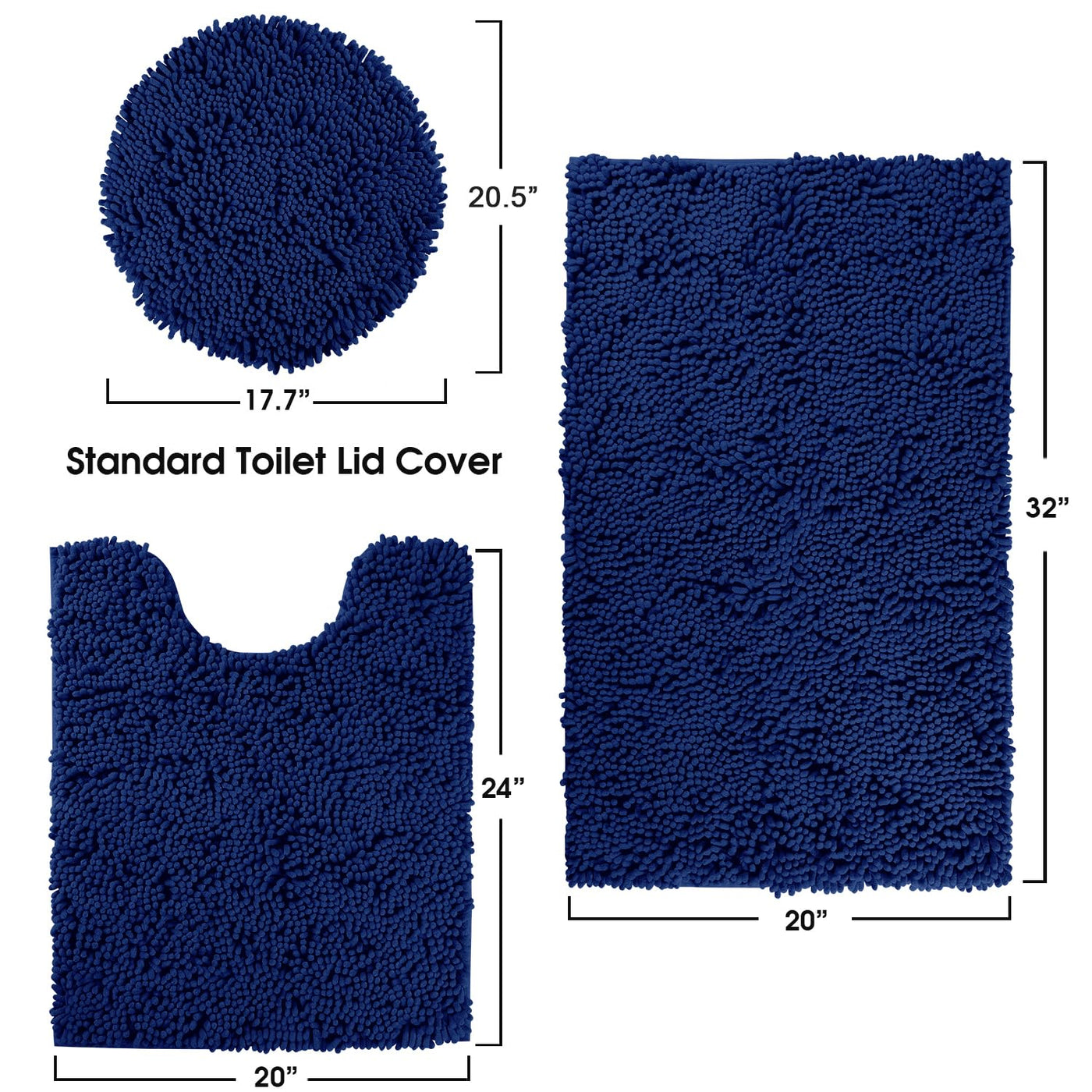 - Q: What are the dimensions of the HOMEIDEAS Navy Blue Bathroom Rugs? A: The set includes one bath rug measuring 20 inches by 32 inches, one U-shape bath contoured rug measuring 20 inches by 24 inches, and one round toilet lid cover suitable for lids measuring 15.5 inches to 19.5 inches.