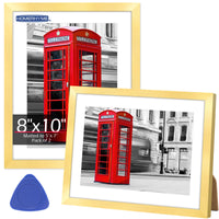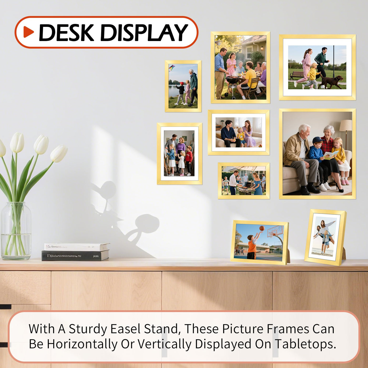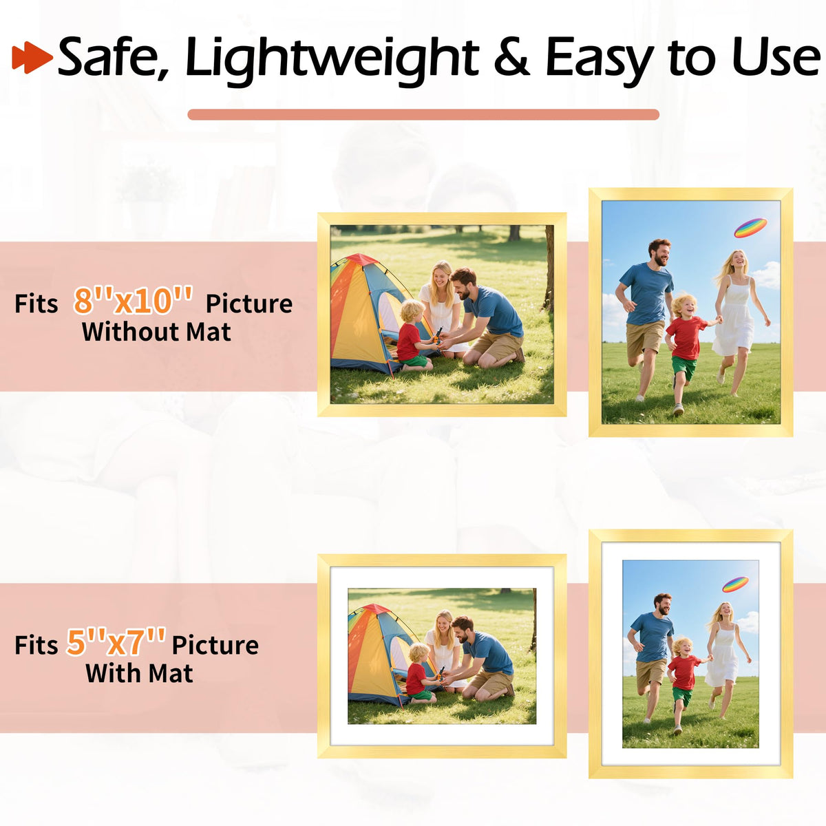 Sturdy 8x10 Picture Frame: Designed to display your treasured memories and favourite photos. With durable HD plastic plexiglass, these 8x10 frames are lightweight and shatter-resistant. This safer alternative to glass protects the frames from dust, moisture, and accidental damage while maintaining crystal-clear visibility. | Easy To Use: This 8 x 10 photo frame comes apart for easy picture insertion. With two built-in hanging hooks, one frame opener allow for easy installation and one easel stand for tabletop display, displaying your photo is a breeze. **Please remove the protective film from both sides of the plexiglass to ensure transparency. | Home Decor & Wall Decor: Each gold picture frame accommodates both 5x7 pictures with a mat or standard 8x10 photos without the mat. This versatility allows you to display different sizes of photos, family pictures or posters, making it an ideal choice for personalising your gallery, home or office. | Wall Hanging & Tabletop Display: This picture frame set is designed with strong brackets on the back so you can hang it horizontally or vertically for a gallery style wall display, or use a stand to display it on a table. This feature allows you to create stunning gallery displays that highlight your favourite images in the orientation that best suits your style and space. | Perfect Gift: This classic gold picture frame makes it a versatile choice for coordinating with existing d