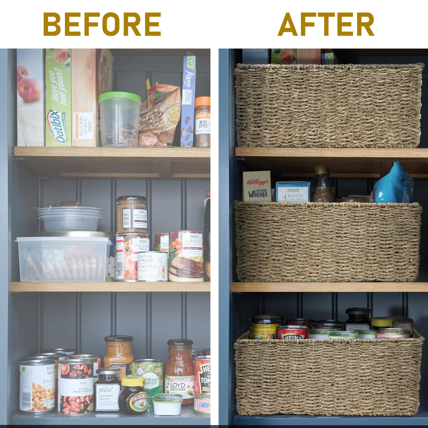 • Q: What materials are used to make these baskets? A: The baskets are crafted from natural seagrass, providing a stylish and eco-friendly storage solution.