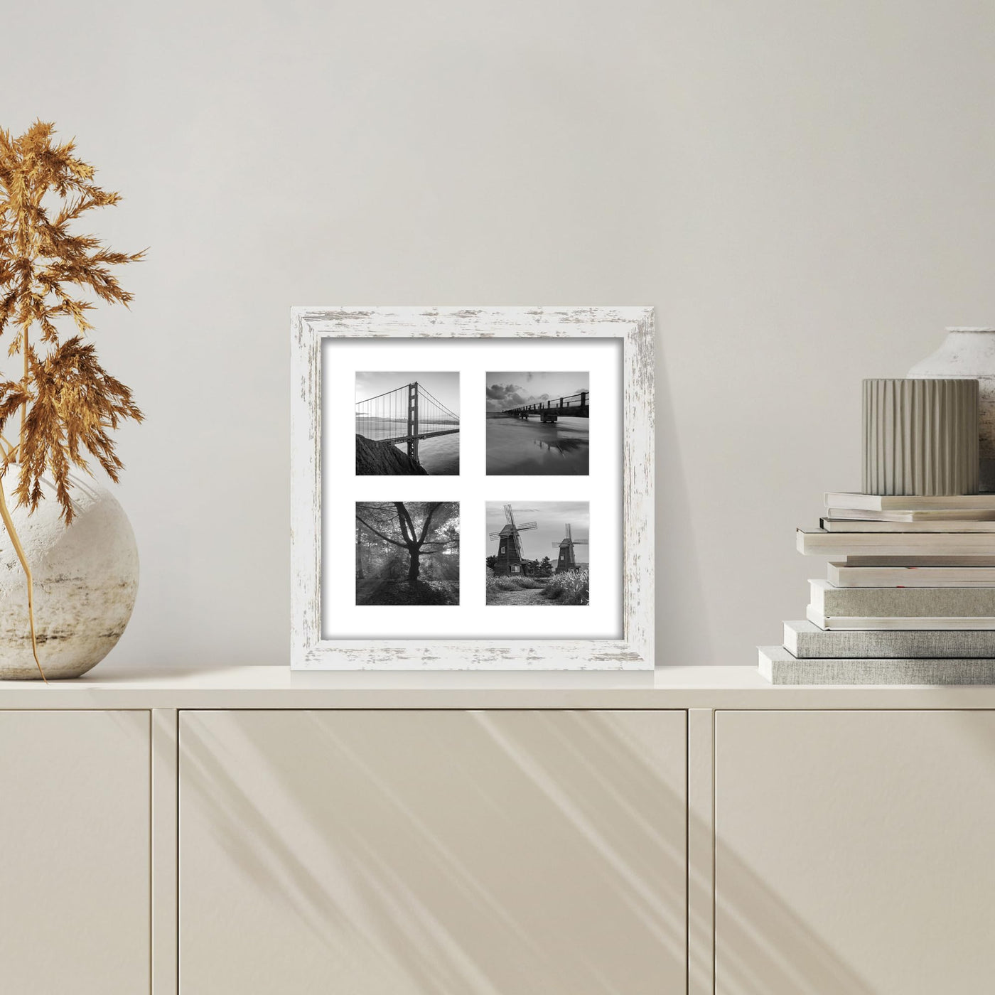Hongkee 10x10 Picture Frame Set of 2, Real Glass and Distressed White Collage Frame, Display Pictures Four Opening 4x4 With Mat