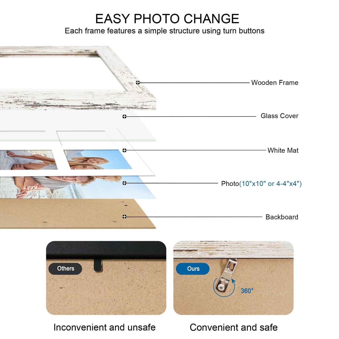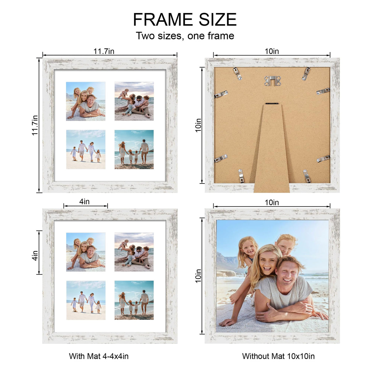 Rustic Wood and Glass - The 10x10 collage picture frames made of durable MDF wood compared to other flimsy PS or plastics frames. we use tempered glass is an exceptional alternative to plexiglass, eliminating the inconveniences of bending, reflection, fragility, and susceptibility to scratches. Its edges are meticulously polished, ensuring your safety and shielding you from the harm caused by sharp glass edges | Fit for 2 Sizes Photos - This 10 by 10 picture frames can display 10x10 picture without mat, 4 open 4x4 picture with mat. The actual mat opening was designed slightly smaller than photo itself in order to hold it steadily while not a defect | Multi Display - Our 10 x 10 photo frame is perfect for displaying any of your cherished memories, children