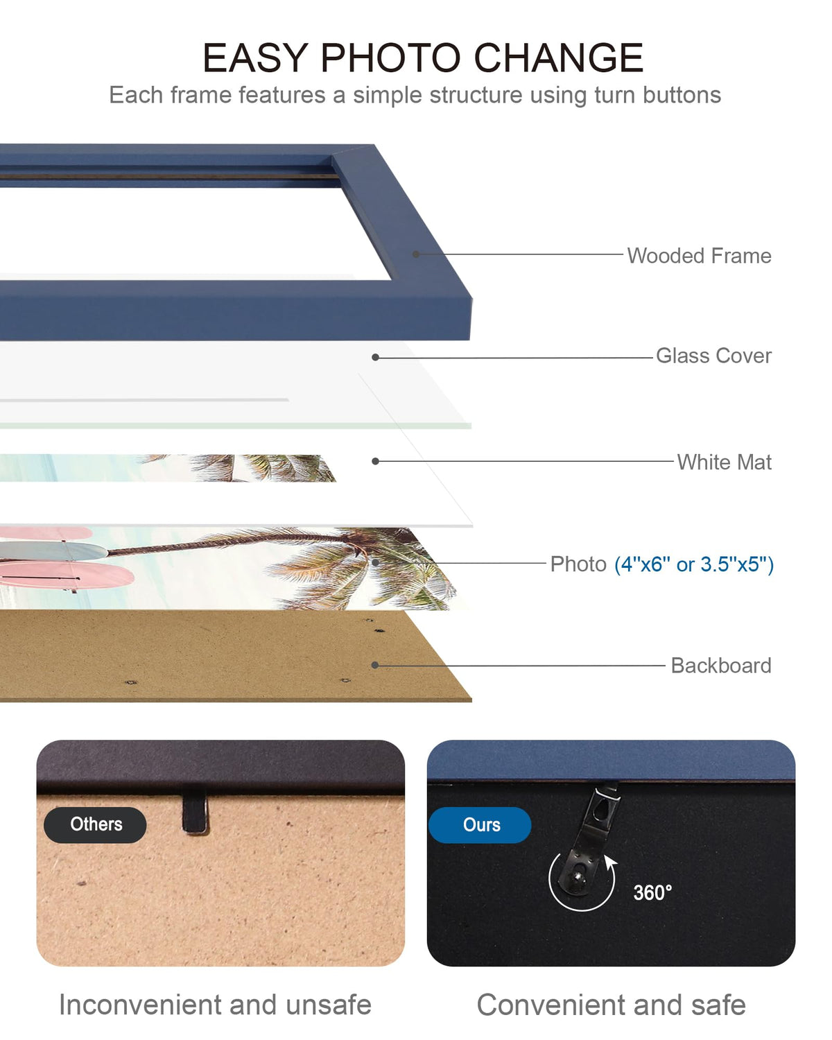 Sturdy Material and Glass: The 4 x 6 frame is made of sturdy wood rather than plastics, great looking and the mounting board is a durable MDF wood. with high-definition real glass cover. Provide you with a clear view. Perfect for displaying family photos, art, prints, or keepsake | One Frame Two Sizes: The 4x6 inch photo frame comes with a mat to display two sizes of photos for every need. This set of frames is suitable for 3.5x5 inch photos no mat or 4x6 inch photos with mat | Easy to Use! The frames 4x6 come with flexible swivel tabs on the back, Spring type action to remove the backing, without hurting fingers. It