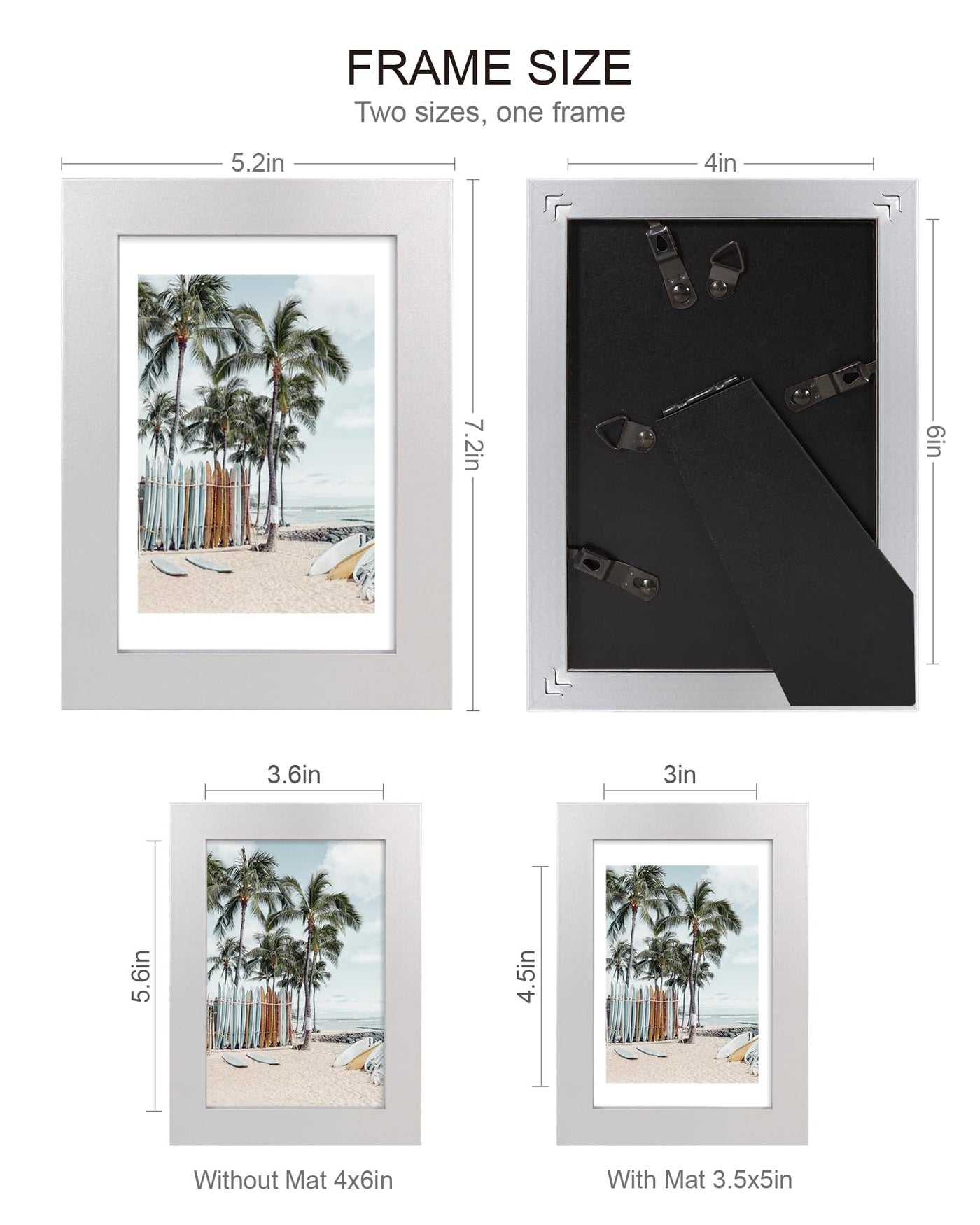 Sturdy Material and Glass: The 4 x 6 frame is made of sturdy wood rather than plastics, great looking and the mounting board is a durable MDF wood. with high-definition real glass cover. Provide you with a clear view. Perfect for displaying family photos, art, prints, or keepsake | One Frame Two Sizes: The 4x6 inch photo frame comes with a mat to display two sizes of photos for every need. This set of frames is suitable for 3.5x5 inch photos no mat or 4x6 inch photos with mat | Easy to Use! The frames 4x6 come with flexible swivel tabs on the back, Spring type action to remove the backing, without hurting fingers. It