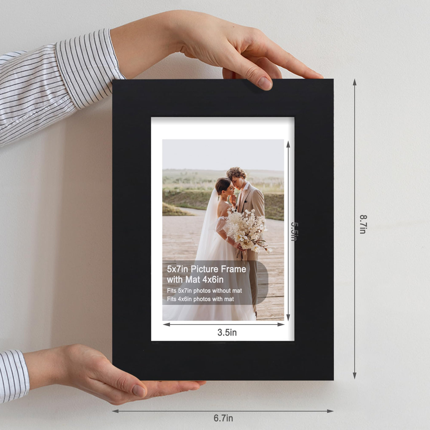 Display Size: 4x6inch with mat or 5x7inch without matFrame size: 8.7x6.7x0.7inchQuantity: 4 piecesPicture Frame Material: Composite Wood Frame,MDF backboard,HD glassFrame Display: Desktop on easel-back, hang on the wall with the mounted hanging hangerInstruction: Take the back off place the picture in and put the back on by sliding the eight fasteners??Tips: The industry standard for mat openings should be 0.5 inches smaller than the photo size so that the photo will not easily fall out.Be sure to add us to your list of favorites so you can easily find us the next time you need a quality picture frame. Thank you for shopping with us.