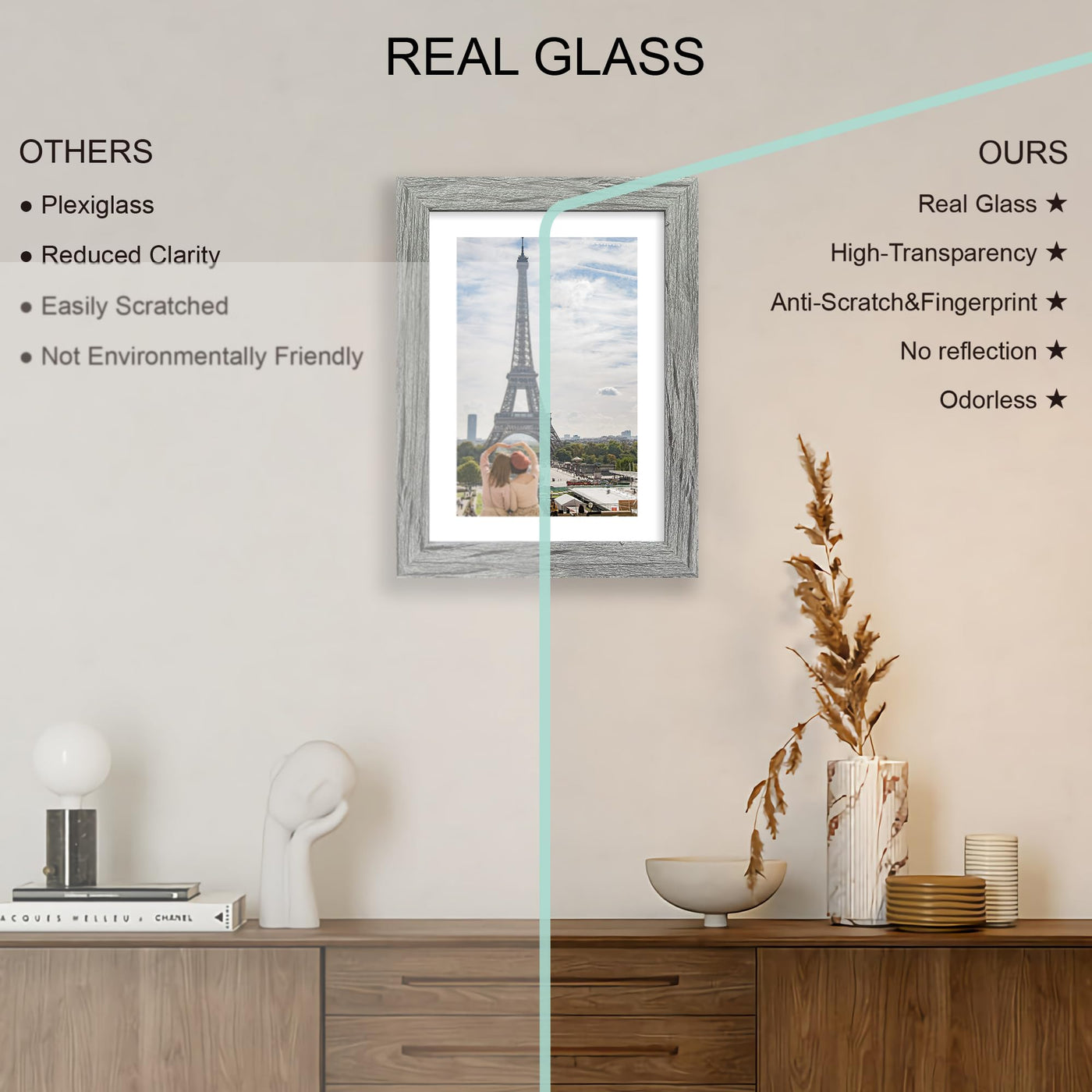 Hongkee 7x10 Picture Frame Set of 4, Made of Real Glass and Grey Frame - Display Picture 5.5x8.5 with Mat or 7x10 Without Mat, 7