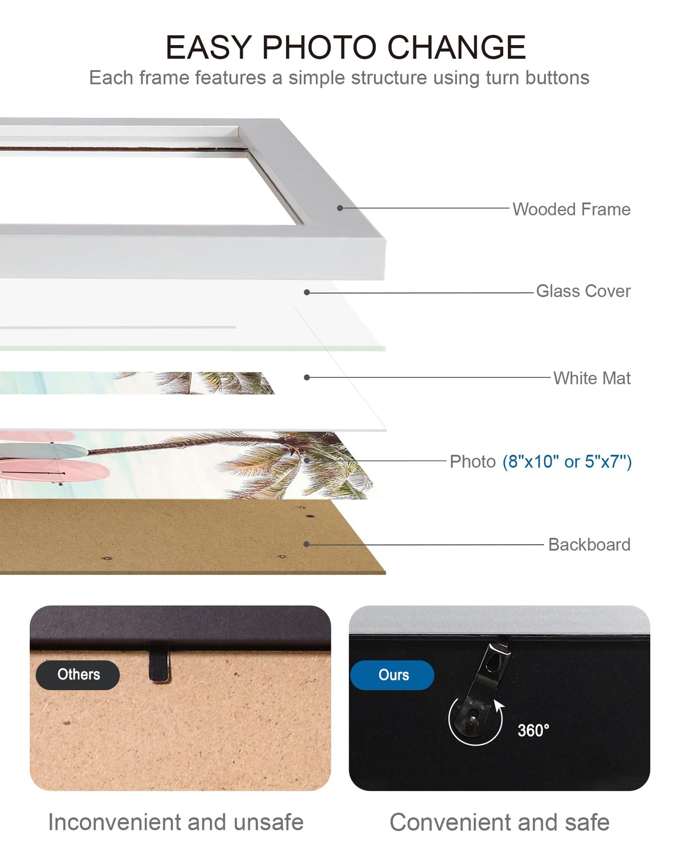 Sturdy Material and Glass: The 8 x 10 frame is made of sturdy wood rather than plastics, great looking and the mounting board is a durable MDF wood. with high-definition real glass cover. Provide you with a clear view. Perfect for displaying family photos, art, prints, or keepsake | One Frame Two Sizes: The 8x10 inch photo frame comes with a mat to display two sizes of photos for every need. This set of frames is suitable for 8x10 inch photos no mat or 5x7 inch photos with mat | Easy to Use! The frames 8x10 come with flexible swivel tabs on the back, Spring type action to remove the backing, without hurting fingers. It