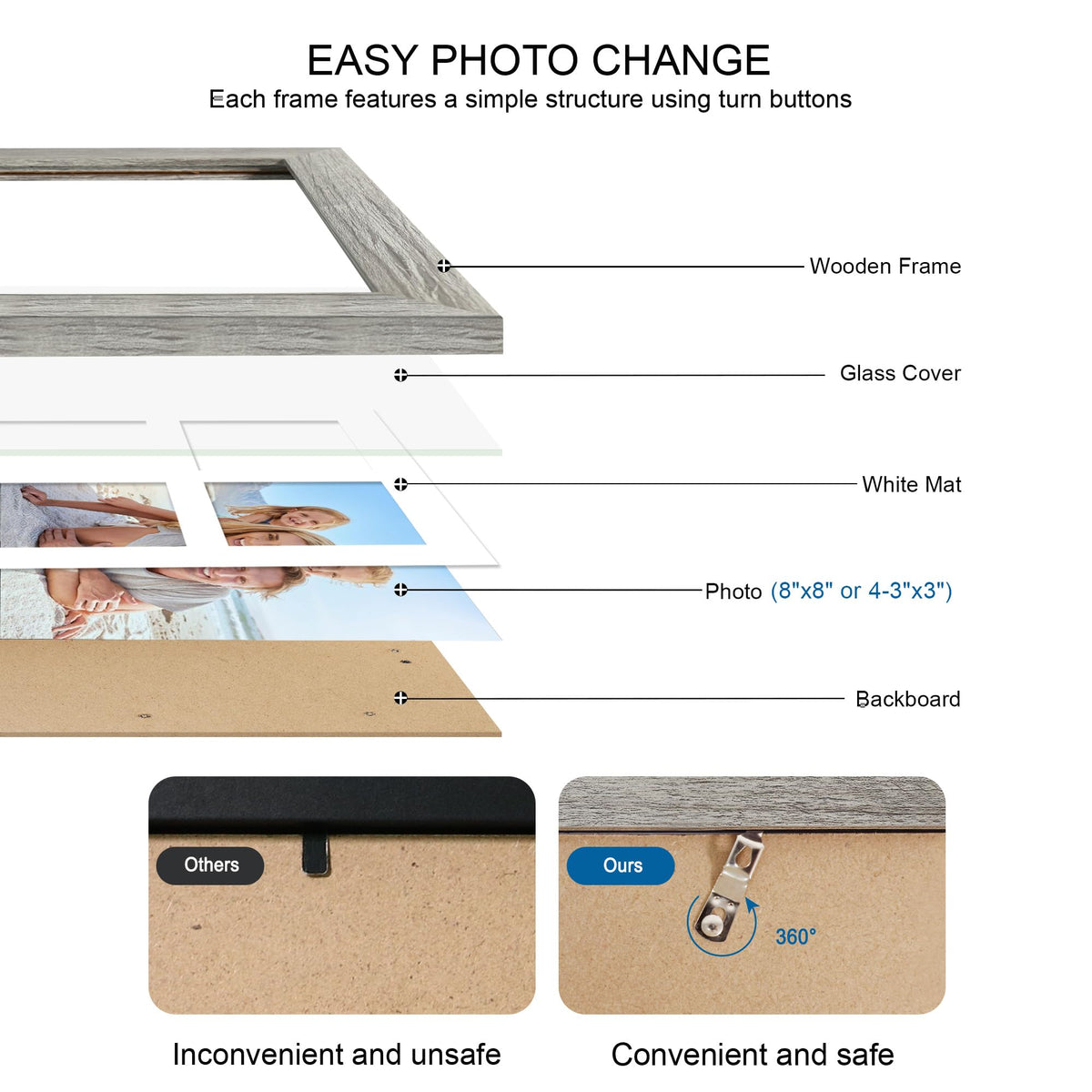 Rustic Wood and Glass - The 8x8 collage picture frames made of durable MDF wood compared to other flimsy PS or plastics frames. we use tempered glass is an exceptional alternative to plexiglass, eliminating the inconveniences of bending, reflection, fragility, and susceptibility to scratches. Its edges are meticulously polished, ensuring your safety and shielding you from the harm caused by sharp glass edges | Fit for 2 Sizes Photos - This 8 by 8 picture frames can display 8x8 picture without mat, 4 opening 3x3 picture with mat. The actual mat opening was designed slightly smaller than photo itself in order to hold it steadily while not a defect | Multi Display - Our 8 x 8 photo frame is perfect for displaying any of your cherished memories, children