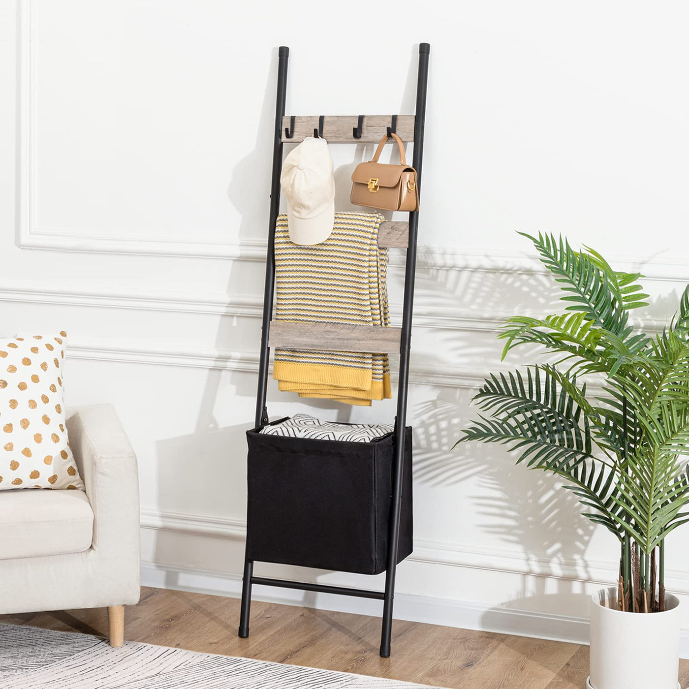 - Q: How many storage options does the ladder provide? A: The ladder includes 3 wooden hanging rods, 1 storage basket, and 4 removable hooks for versatile storage solutions.