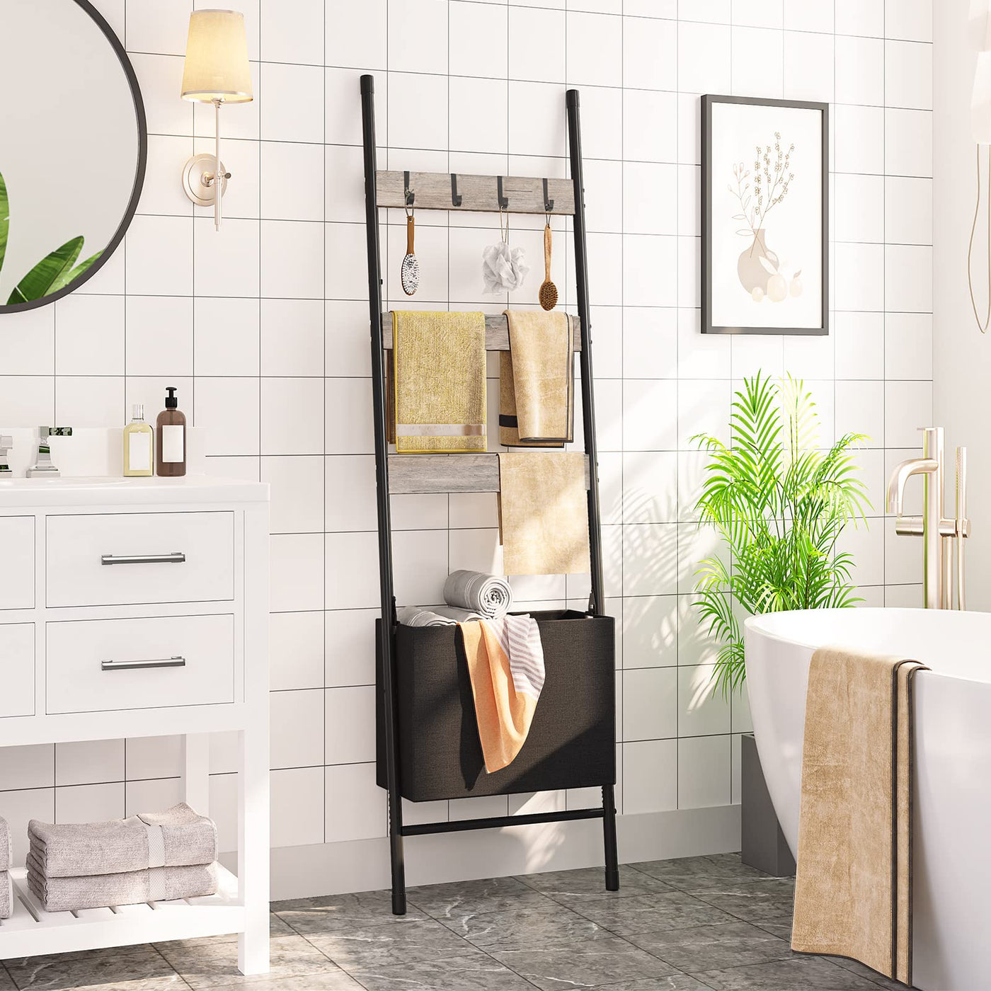 HOOBRO Blanket Ladder with Basket 17.3 L x 63.4 H Towel Rack with Hooks Blanket Holder Rack Decorative Ladder Shelf Drying and Display Rack for Bathroom Living Room Greige BG31CJ01
